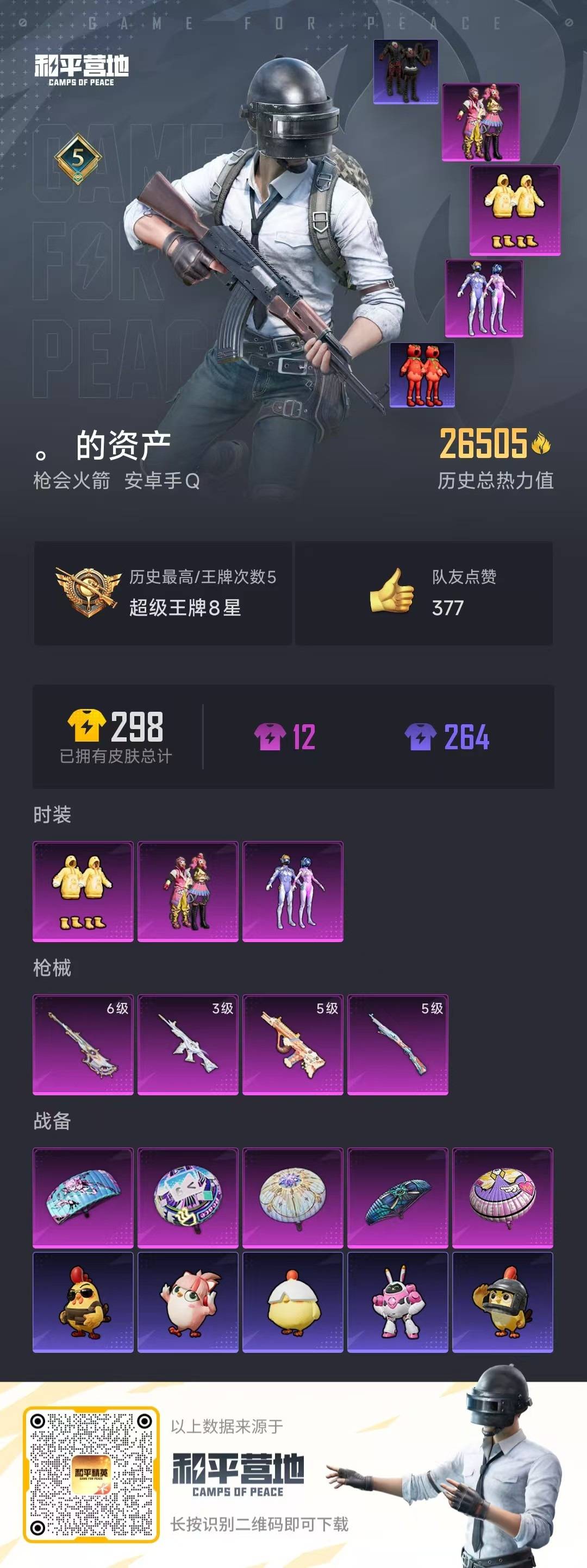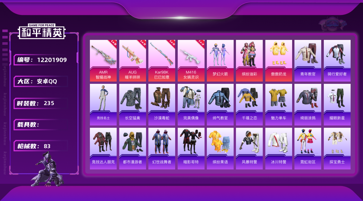 - [12171364]12粉装 13特效枪 18印记 可二次 可修改实名 战神框 身法装备:Mark.06(新蓝螳螂) 优质装备:M416心之恋语,古堡领主,宝贝奶油派,SCAR-L纯梦嫁纱,Kar98K未来歌姬,SCAR-L-锦绣绵绵,七级SCAR-L-纯梦嫁纱,七级M416-心之恋语,UMP45量子极限,六级爆炸猎弓-拳皇·狂花道,DP-28-千金淑猫,千金淑猫,月影灵韵,MK14-盛世惊鸿,智耀战神,AUG-圣斗士星矢,星穹咏叹调,AKS-74U-星穹咏叹调,羊梦糖心,平底锅-喜羊羊与灰太狼,Kar98K-巳巳如意 热门装扮:音爆索尼克,蔷薇星,暗夜玫瑰,闲梦青缨,创世·救赎,神秘黑猫,爱崽白熊 稀有枪皮:爆炸猎弓-拳皇·狂花道,DP-28-豹影疾电 六级特效枪:六级Kar98K-未来歌姬 五级特效枪:五级UMP45-量子极限,五级DP-28-千金淑猫,五级Kar98K-巳巳如意,五级DP-28-豹影疾电,五级AUG-圣斗士星矢,五级AKS-74U-星穹咏叹调,五级SCAR-L-锦绣绵绵 三级特效枪:三级平底锅-喜羊羊与灰太狼,三级MK14-盛世惊鸿 紫色装扮:幻彩翩翩,SS23特训,妙红点点,SS30特训套装,SS31特训套装,云朵鹅,彩虹兔,雪绒豹,SS33特训套装,青涩时光,旭日情侣,灵蜜圈圈,碧波幻想,SS21特训,琉璃情波,田园牧歌,轻风白浪,和煦暖阳,SS22特训,莱茵河畔,香榭午后,龙舌兰冰茶,顶瓜瓜,圣诞大吉,冷焰舞者,北国孤狼,千禧之恋,吉莉礼服,坚韧舞者,夏日音浪,夜莺强袭者,完美偶像,帅气教官,幻世战舞者,幻影武者,萌趣咩咩,乐音,SS2特训,SS5特训,军械专家,暖心熊熊,娇憨猪猪,SS16特训,冰爽风暴,瑞龙福将,团圆交子,醒狮腾龙,SS17特训,冰爽海盐,治愈之星,迅捷之星,科技之星,SS14特训,萌趣颜团子,特种颜团子,星梦畅游,SS15特训,SS20特训,甜心亚梦,虚音幻奏,暖心橘喵,怒火燎原,焰山流火,异彩先驱,SS18特训,雪兔飞飞,飞驰魅影,音速流光,SS19特训,战地菁英,黄色名流,青年教官,青春校园,飞行日记,骑行爱好者,魅力单车,鹤鸣,麻辣教官,黄色伏地魔,黄色运动,黎明保卫者,黑色伏地魔,龙的传人,龟仙人,冰河战士,龙魂突击队,蝶变,香桃花海,霓虹街区,跃动心情,酒红色名流,霓虹极客,野性战心,野性战魂,金鼠迎春,长空猛禽,雪山精英