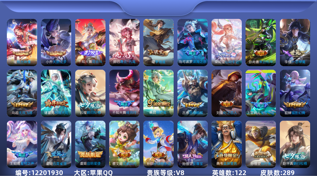 [12201930]V8 2典藏 2无双 19传说 122英雄 289皮肤 可修改实名 优质装备:天鹅之梦(小乔典藏),青丘·九尾(妲己无双),花合斗,拾光映像(瑶典藏),猫影幻舞,一念神魔,云霓雀翎,末日机甲-孙尚香(绿蚂蚱),李逍遥,时之恋人-刘备(电焊工),花朝如约(花篮子),无双飞将,青丘·九尾,妄想奇谈,鹤归松栖(云缨),小动物乐团,朵莉亚心动手记 珍宝阁皮:优雅恋人,玩趣恶龙 限定皮:陌上桑,鸣野蒿,至尊宝,星穹之声,绯月行,时雨天司(水龙头),至美·乘鲤谣,怒海麟威,五谷丰年,御风骁将(吕布年限),天狼狩猎者,李小龙,逐梦之影,霸王别姬-虞姬,默契交锋-花木兰,孙行者,蜜橘之夏,深海之息(深海大菠萝),神器·万象笔 史诗皮:琥珀纪元伽罗,芈月浮光幕影,海诺心动手记,上官婉儿群星魔术团,超元猎域,百相守梦-百里守约,遇见神鹿,紫霞仙子,电玩小子(小书包),白龙吟,黄金分割率,特工魅影,千年之狐,冰冠公主,鹤归松栖(赵怀真),江河有灵,青蛇,高渐离燃音魔法,蒙恬荣光圣徽,魅语,无限星赏官,晚萤,百相守梦(关羽),银翎春语,暗夜猫娘,猫狗日记-大乔,时之恋人-孙尚香,乱世虎臣,节奏热浪,修罗,女仆咖啡,水果甜心,绅士熊喵,天才门将,星夜王子,心灵骇客,时之奇旅-安琪拉,功夫厨神,幽灵船长,鬼剑武藏,暗渊魔法,心灵战警,天秀·启明,舞动绿茵,地狱岩魂,纤云弄巧,缤纷独角兽,乘风破浪,逐浪之夏,月团寄思,水晶猎龙者,热力回旋,箭羽风息,金属风暴,原初追逐者,圣诞狂欢,圣诞恋歌,鹰眼统帅,暗夜贵公子,魅力维加斯,天秀·音浪,滕王阁序,千筹问战,无心,未来纪元-赵云