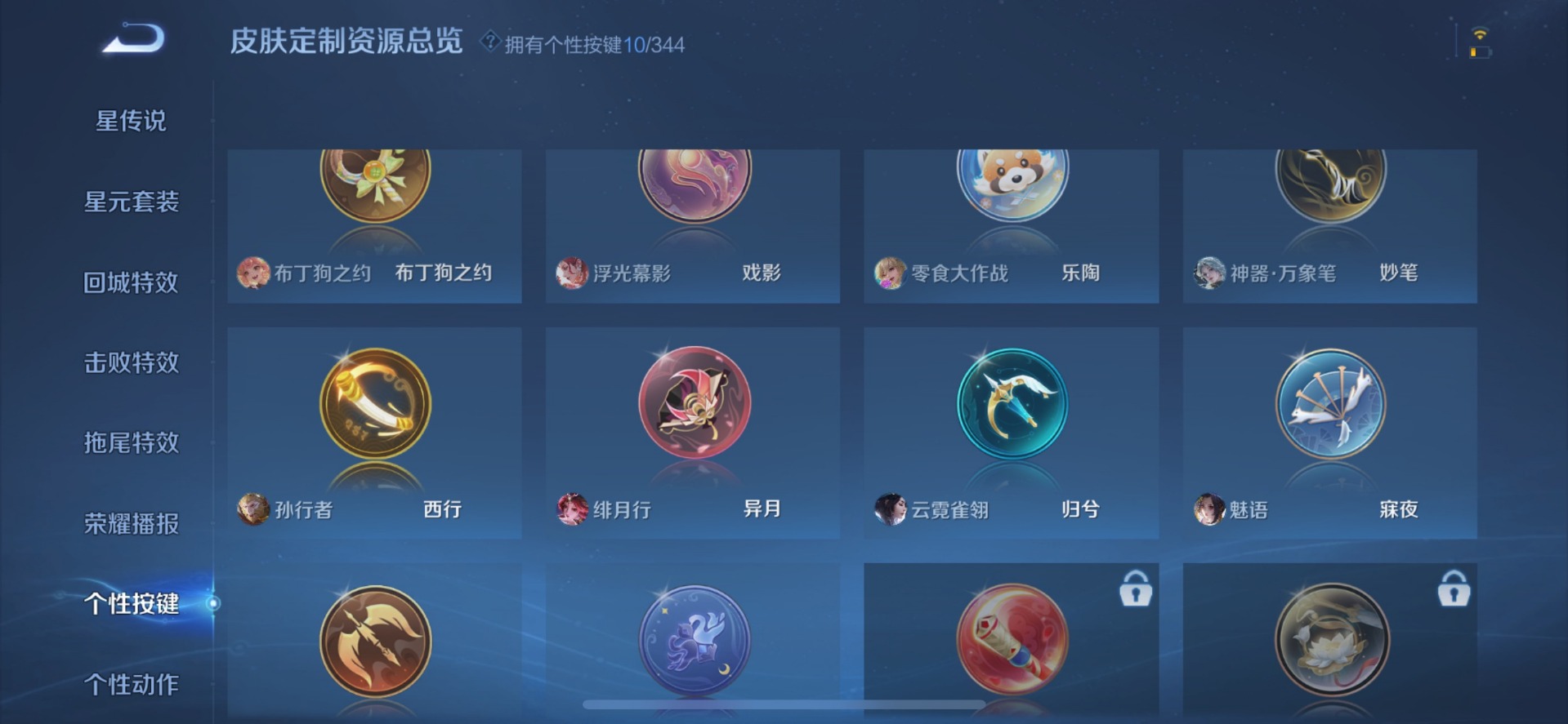 不知火舞绯月行,吕布御风骁将,诸葛亮时雨天司,公孙离蜜橘之夏,裴擒虎李小龙,裴擒虎天狼狩猎者,上官婉儿神器·万象笔,花木兰默契交锋,艾琳陌上桑,马可波罗深海之息,西施至美·乘鲤谣,桑启鸣野蒿,孙悟空孙行者,孙悟空至尊宝,韩信逐梦之影,虞姬霸王别姬,王昭君星穹之声