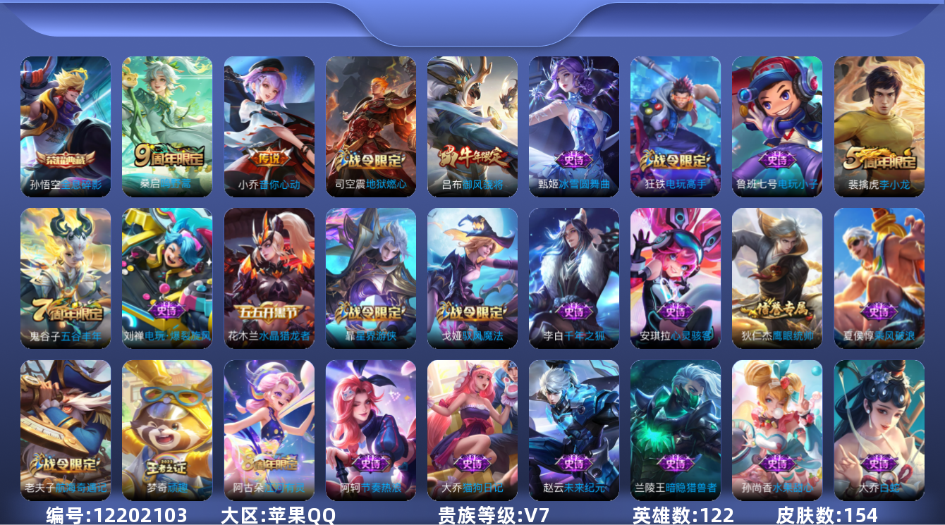 [12202103]V7 1典藏 2传说 122英雄 154皮肤 可修改实名 优质装备:全息碎影(猴子典藏),音你心动-小乔 珍宝阁皮:优雅恋人 限定皮:鸣野蒿,高山流水,五谷丰年,御风骁将(吕布年限),李小龙 史诗皮:电玩小子(小书包),白龙吟,千年之狐,江河有灵,白蛇,电玩·爆裂旋风,猫狗日记-孙策,猫狗日记-大乔,节奏热浪,摇滚巨星,水果甜心,天才门将,心灵骇客,暗隐猎兽者,鬼剑武藏,乘风破浪,水晶猎龙者,金属风暴,鹰眼统帅,魅力维加斯,未来纪元-赵云