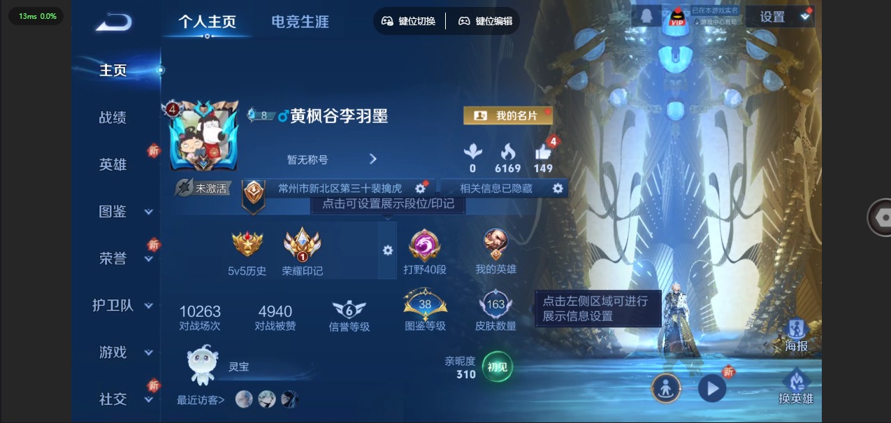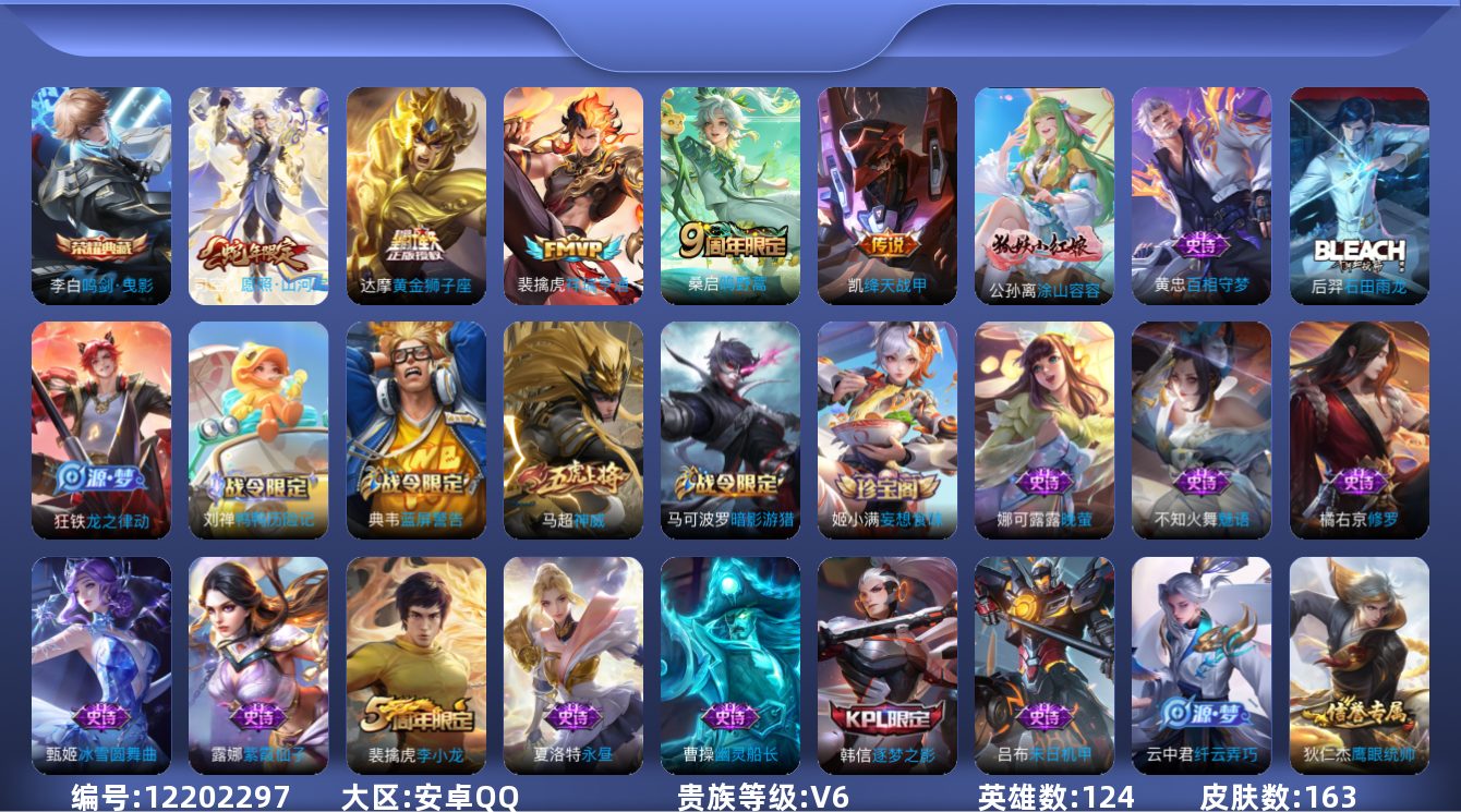 [12202297]V6 1典藏 5传说 124英雄 163皮肤 可修改实名 优质装备:鸣剑·曳影,黄金狮子座,绛天战甲(鸡嘴战神),涂山容容 传说皮:祥瑞亨通 珍宝阁皮:妄想食味 限定皮:愿照·山河定(司空震年限),鸣野蒿,神威(电光马子),李小龙,逐梦之影,匿光追影者 史诗皮:鸭鸭历险记-刘禅,龙之律动,星界战将,石田雨龙,百相守梦-黄忠,紫霞仙子,白龙吟,黄金分割率,特工魅影,永昼,冰冠公主,蒙恬荣光圣徽,魅语,晚萤,龙骑士(小龙虾),末日机甲-吕布,猫狗日记-孙策,乱世虎臣,修罗,水果甜心,绅士熊喵,功夫厨神,德古拉伯爵,暗隐猎兽者,幽灵船长,鬼剑武藏,地狱岩魂,纤云弄巧,乘风破浪,逐浪之夏,金属风暴,原初追逐者,圣诞狂欢,圣诞恋歌,鹰眼统帅,暗夜贵公子,黎明之约,未来纪元-赵云