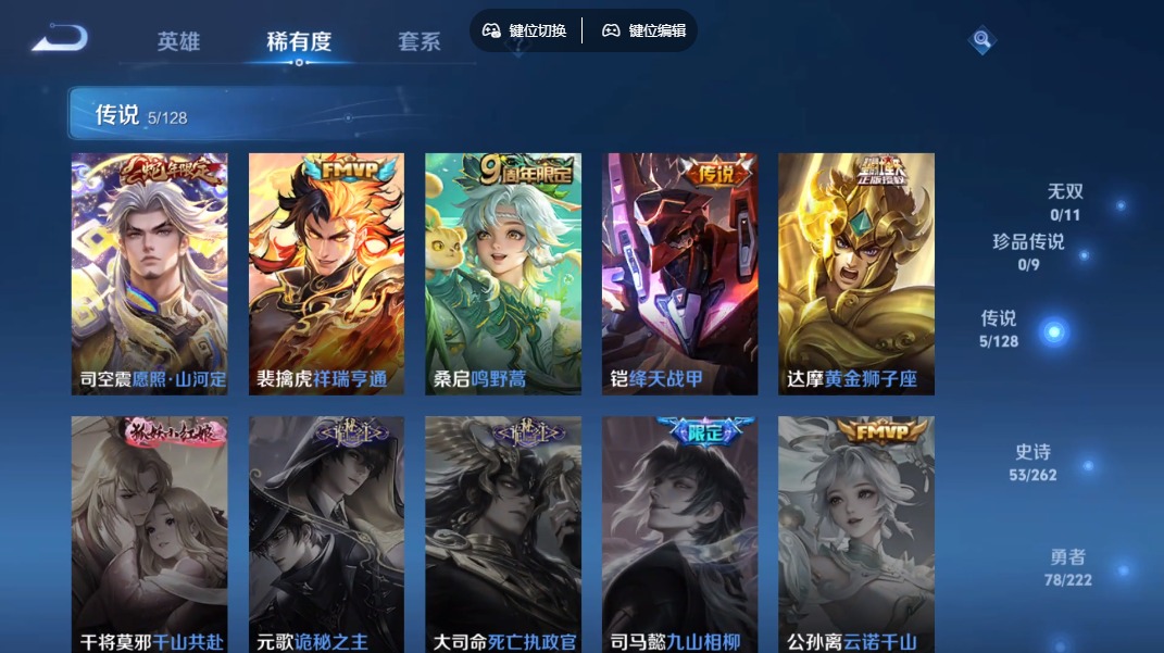 - PX_2080818-84 安卓QQ/最强王者/269皮肤/125英雄/3典藏/0珍品无双/0无双/1珍品传说/25传说/91史诗/9稀有英雄 【1 珍品传说】大耳狗之梦 瑶, 【3 典藏皮肤】鸣剑·曳影 李白,全息碎影 孙悟空,九霄神辉 花木兰, 【25 传说皮肤】胖达荣荣 梦奇,启明星使 虞姬,云霓雀翎 虞姬,时之祈愿 瑶,云鹰飞将 曜,补天 女娲,仲夏夜之梦 貂蝉,炽阳神光 镜,寅虎·瑞焰