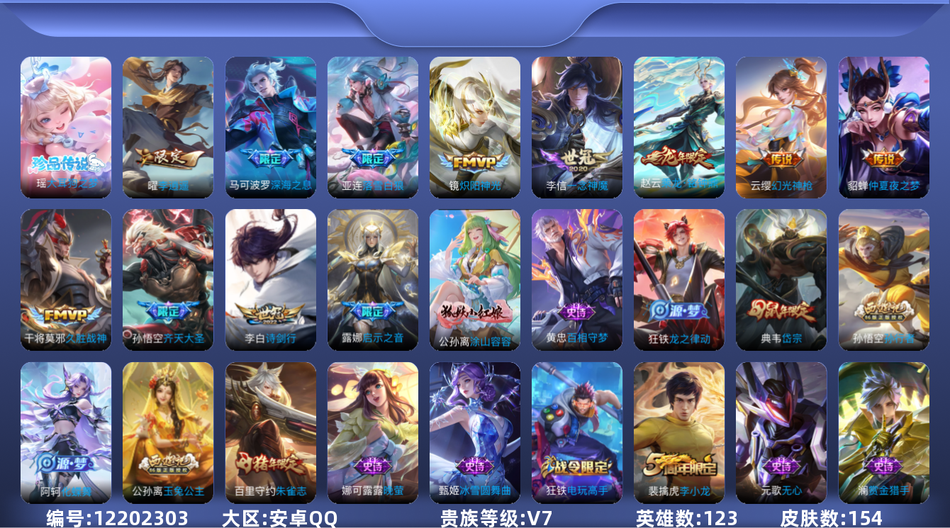 [12202303]V7 1珍品传说 12传说 123英雄 154皮肤 可修改实名 优质装备:大耳狗之梦,久胜战神,炽阳神光,一念神魔,仲夏夜之梦(大飞蛾),李逍遥,涂山容容 传说皮:乘龙·铭钟鼎(赵云年限),落雪白狼,幻光神枪 珍宝阁皮:蔷薇恋人 限定皮:高山流水,诗剑行,齐天大圣,五谷丰年,梁祝,岱宗(典韦年限),李小龙,朱雀志(守约年限),孙行者,美猴王,玉兔公主,启示之音,深海之息(深海大菠萝) 史诗皮:化蝶舞,龙之律动,百相守梦-黄忠,苍穹之光,黄金分割率,特工魅影,千年之狐,江河有灵,百解令(蒙犽),高渐离燃音魔法,无限星赏官,偶像歌手,晚萤,猫狗日记-孙策,节奏热浪,水果甜心,星夜王子,德古拉伯爵,暗隐猎兽者,鬼剑武藏,心灵战警,地狱岩魂,纤云弄巧,拒霜思,乘风破浪,箭羽风息,圣诞狂欢,鹰眼统帅,魅力维加斯,黎明之约,赏金猎手,无心,未来纪元-赵云