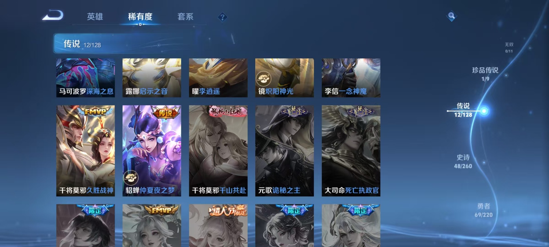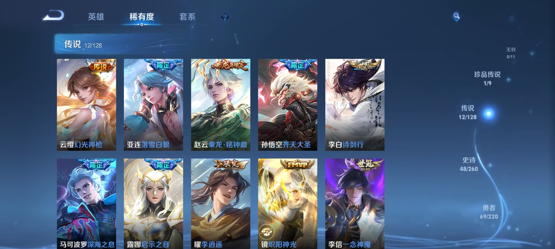 - PX_2109956-Q/无双王者/271皮肤/124英雄/2典藏/0珍品无双/0无双/3珍品传说/16传说/81史诗/8稀有英雄 【3 珍品传说】酷洛米之心 安琪拉,大耳狗之梦 瑶,器灵·落星盏 嫦娥, 【2 典藏皮肤】全息碎影 孙悟空,拾光映像 瑶, 【16 传说皮肤】启明星使 虞姬,飞鸢探春 李元芳,白虎志 百里玄策,零号·赤焰 孙悟空,地狱火 孙悟空,永曜之星 杨戬,凤求凰 李白,猫影幻舞