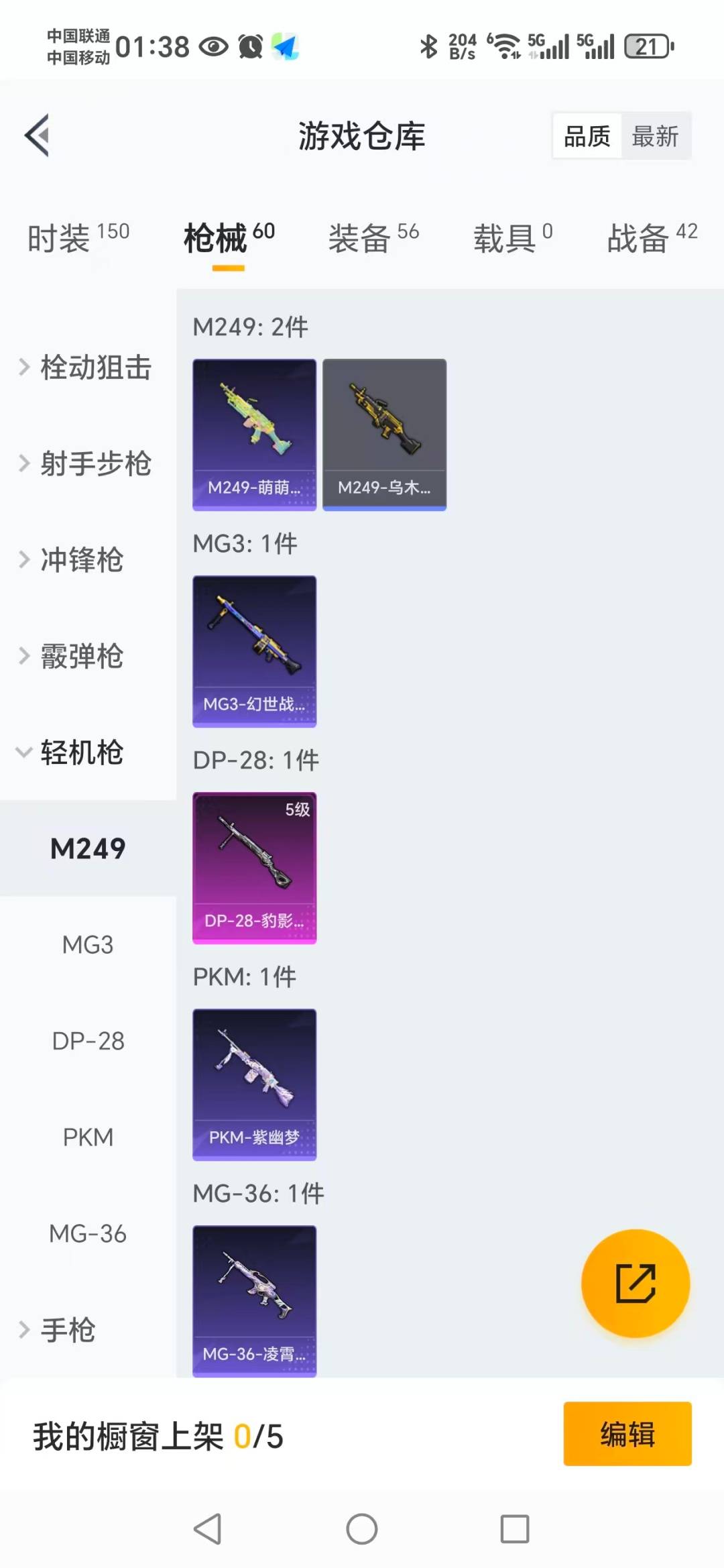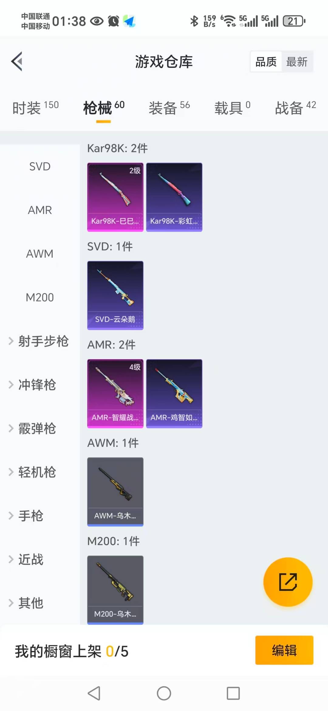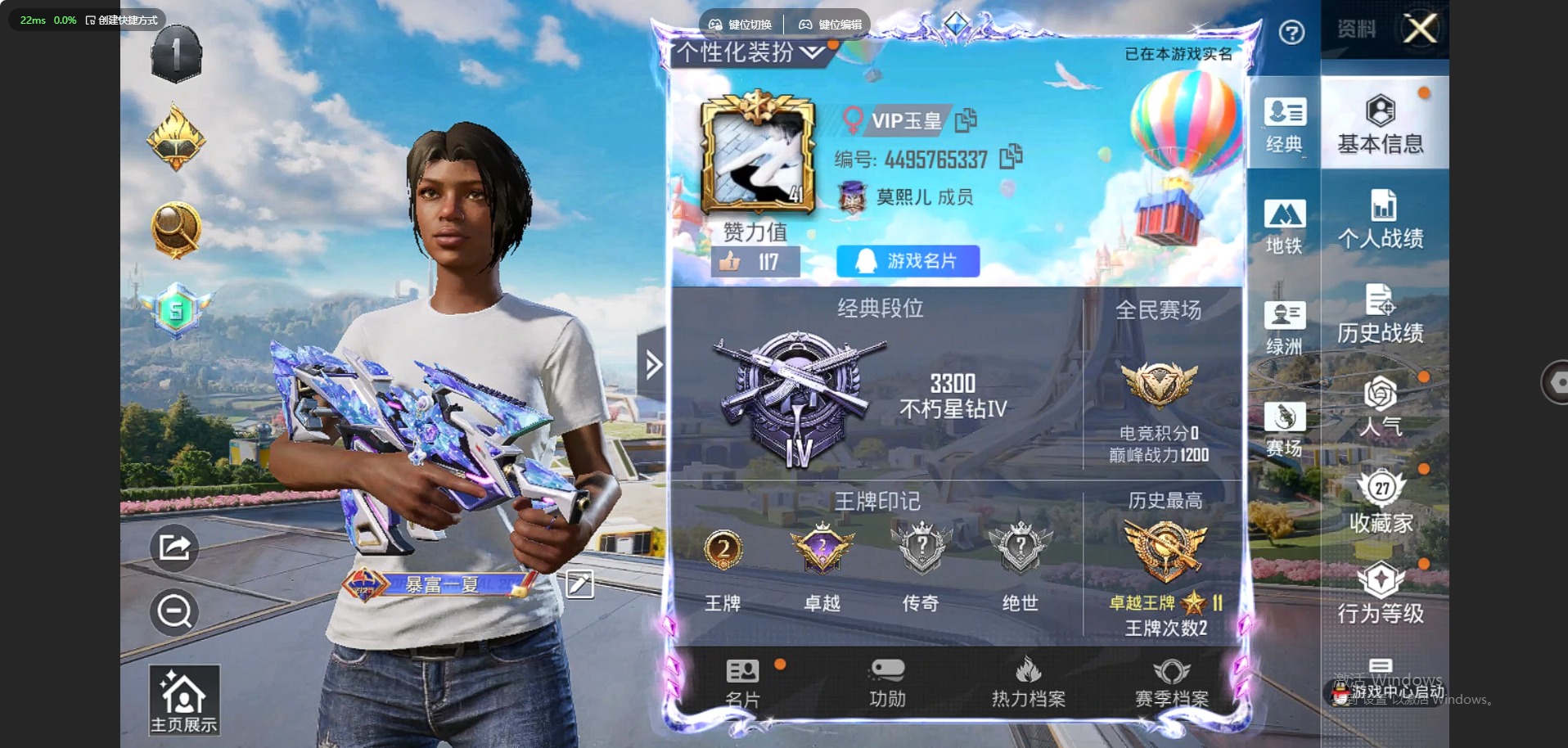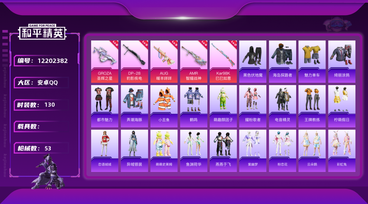 [12202382]5特效枪 2印记 可二次 可修改实名 优质装备:AUG-暖羊咩咩,GROZA-圣辉之星,AMR-智耀战神,Kar98K-巳巳如意 稀有枪皮:DP-28-豹影疾电 六级特效枪:六级GROZA-圣辉之星 五级特效枪:五级DP-28-豹影疾电,五级AUG-暖羊咩咩 四级特效枪:四级AMR-智耀战神 二级特效枪:二级Kar98K-巳巳如意 紫色装扮:云朵鹅,彩虹兔,雪绒豹,SS33特训套装,电音精灵,萌趣颜团子,魅力单车,鹤鸣,黑色伏地魔,都市魅力,海岛探路者,柠萌假日,绮丽涂鸦,王牌教练,鱼渊荷华,燕燕于飞,异域银装,小丑鱼,耀粉歌者,大橘大利,SS32特训服(SS32特训套装),萌萌史莱姆,幽秘之星,蓝冰羽,紫幽梦,粉恋花,恋语绒绒,弄潮海豚 优质战备:幻彩电音降落伞,智耀战神降落伞,雪月幻音降落伞