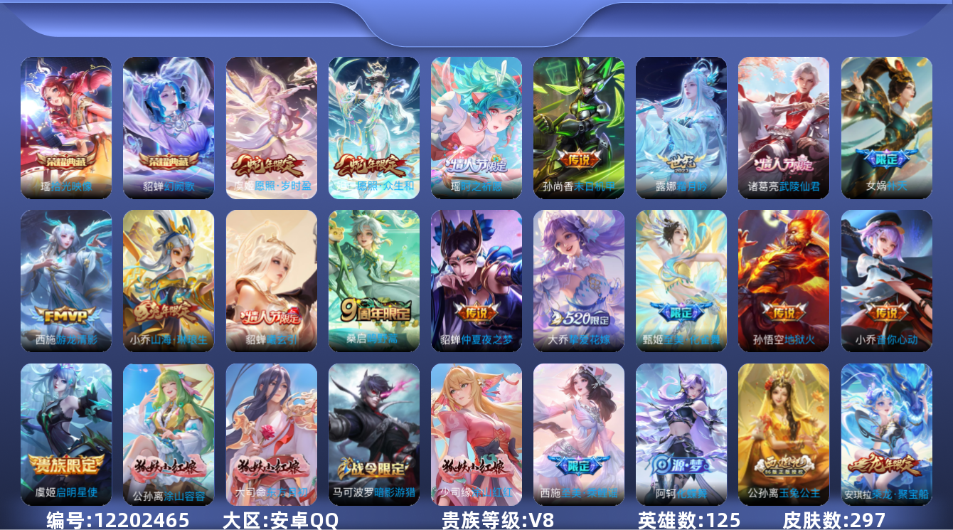 - [12268040]V10 6典藏 2无双 36传说 126英雄 335皮肤 典藏英雄武则天 可修改实名 优质装备:星空梦想(太空人),倪克斯神谕(宇宙婆娘),无限飓风号(高达),鸣剑·曳影,星域神启(倪克斯贼亮),碎月剑心(李白无双),神鉴启示录,小乔时之魔女(小乔无双),黄金射手座,冠军飞将,云鹰飞将(小将军),绛天战甲(鸡嘴战神),久胜战神,炽阳神光,一念神魔,云霓雀翎,地狱火,仲夏夜之梦(大飞蛾),音你心动-小乔,飞鸢探春,音你心动-周瑜,胖达荣荣,乞巧织情,时之恋人-刘备(电焊工),游龙清影(小青龙),淬星耀世,遇见胡旋,碎云,神器·狴犴令,山海·炽霜斩(李信年限),惊梅引,艾琳觅芳踪,琥珀纪元铠,涂山容容 传说皮:乘龙·问璇玑(孙尚香年限),乘龙·铭钟鼎(赵云年限),乘龙·淬吴钩(孙策年限),吕布曦玄引,典韦战鼓燎原 珍宝阁皮:优雅恋人,女武神 限定皮:鸣野蒿,至尊宝,傲雪梅枪,绯月行,神威(电光马子),高山流水,诗剑行,怒海麟威,青龙志(铠年限),梁祝,烈魂,李小龙,辉光之辰,孙行者,寅虎·心曲(虎婆),深海之息(深海大菠萝),山海·玄木吟(马可年限) 史诗皮:曹操夜都魔契,超元猎域,乘龙·聚宝船(安琪拉年限),乘龙·忆丹青(大乔年限),遇见神鹿,紫霞仙子,苍穹之光,电玩小子(小书包),黄金分割率,特工魅影,千年之狐,永昼,魅语,高渐离燃音魔法,无限星赏官,冰冠公主,青蛇,偶像歌手,白蛇,晚萤,暗夜猫娘,龙骑士(小龙虾),末日机甲-吕布,猫狗日记-孙策,时之恋人-孙尚香,乱世虎臣,节奏热浪,修罗,女仆咖啡,摇滚巨星,水果甜心,绅士熊喵,天才门将,星夜王子,心灵骇客,功夫厨神,德古拉伯爵,暗隐猎兽者,幽灵船长,鬼剑武藏,心灵战警,乐园奇幻夜,舞动绿茵,地狱岩魂,纤云弄巧,繁星吟游(呼啦呼啦),拒霜思,缤纷独角兽,乘风破浪,逐浪之夏,月团寄思,水晶猎龙者,曙光守护者,箭羽风息,金属风暴,原初追逐者,圣诞狂欢,圣诞恋歌,鹰眼统帅,王者之锤,魅力维加斯,赏金猎手,无心,未来纪元-赵云