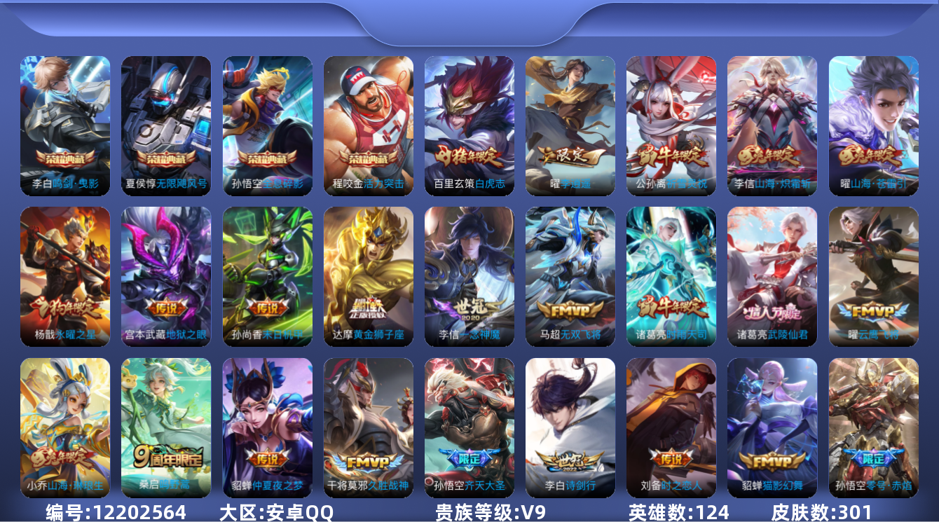 [12202564]V9 4典藏 26传说 124英雄 301皮肤 可修改实名 优质装备:无限飓风号(高达),活力突击,鸣剑·曳影,全息碎影(猴子典藏),黄金狮子座,云鹰飞将(小将军),猫影幻舞,久胜战神,一念神魔,云霓雀翎,末日机甲-孙尚香(绿蚂蚱),仲夏夜之梦(大飞蛾),零号·赤焰,地狱之眼,飞鸢探春,李逍遥,时之恋人-刘备(电焊工),无双飞将,山海·炽霜斩(李信年限),山海·琳琅生(小乔年限),山海·苍雷引(电光曜子) 珍宝阁皮:蔷薇恋人,玩趣恶龙 限定皮:逐霄战戟,陌上桑,鸣野蒿,至尊宝,白虎志(电光耗子),武陵仙君(小桃花),时雨天司(水龙头),神威(电光马子),山海·碧波行(瑶年限),高山流水,诗剑行,齐天大圣,五谷丰年,冰锋战神,天狼运算者,游园惊梦,御风骁将(吕布年限),龙胆,逐梦之星,烈魂,天狼溯光者,奔雷神使(牛魔年限),祈雪灵祝(雪兔子),天狼绘梦者,李小龙,逐梦之光,永曜之星,辉光之辰,奇迹圣诞,神奇女侠,山海·玄木吟(马可年限) 史诗皮:星界战将,谪仙醉月,石田雨龙,破空之剑,蒙犽顽岩魄,遇见神鹿,紫霞仙子,苍穹之光,电玩小子(小书包),黄金分割率,江河有灵,真我赫兹(百里守约),魅语,百解令(蒙犽),蒙恬荣光圣徽,无限星赏官,冰冠公主,偶像歌手,白蛇,晚萤,电玩·爆裂旋风,龙骑士(小龙虾),末日机甲-吕布,猫狗日记-孙策,乱世虎臣,节奏热浪,修罗,女仆咖啡,摇滚巨星,水果甜心,绅士熊喵,星夜王子,心灵骇客,功夫厨神,德古拉伯爵,暗隐猎兽者,幽灵船长,鬼剑武藏,心灵战警,地狱岩魂,纤云弄巧,繁星吟游(呼啦呼啦),拒霜思,缤纷独角兽,乘风破浪,逐浪之夏,水晶猎龙者,曙光守护者,箭羽风息,金属风暴,原初追逐者,圣诞狂欢,圣诞恋歌,鹰眼统帅,魅力维加斯,无心,未来纪元-赵云