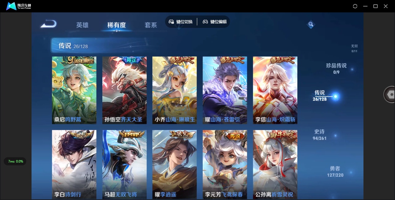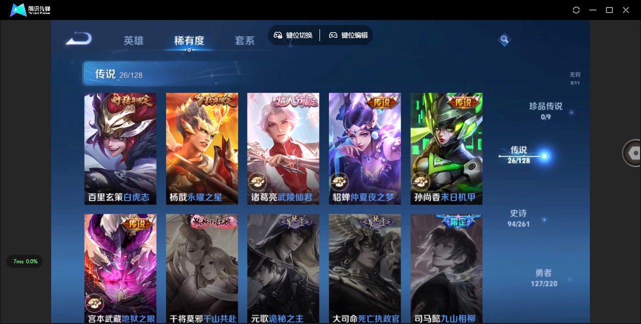 - [11524352]V7 1典藏 6传说 123英雄 235皮肤 可修改实名 优质装备:鸣剑·曳影,云鹰飞将(小将军),超时空战士-狄仁杰,山海·炽霜斩(李信年限) 传说皮:幻光神枪 珍宝阁皮:蔷薇恋人,玩趣恶龙 限定皮:愿照·九州拓(澜年限),逐霄战戟,神威(电光马子),高山流水,齐天大圣,五谷丰年,梁祝,猪悟能,青春决赛季,山海·玄木吟(马可年限) 史诗皮:鸭鸭历险记-刘禅,器灵·浮梦炉,化蝶舞,龙之律动,蔬乡物语(鲁班七号),紫霞仙子,特工魅影,永昼,电玩·爆裂旋风,江河有灵,百解令(蒙犽),高渐离燃音魔法,蒙恬荣光圣徽,偶像歌手,冰冠公主,末日机甲-吕布,猫狗日记-孙策,节奏热浪,修罗,女仆咖啡,水果甜心,星夜王子,心灵骇客,功夫厨神,德古拉伯爵,暗隐猎兽者,幽灵船长,鬼剑武藏,地狱岩魂,纤云弄巧,拒霜思,缤纷独角兽,乘风破浪,逐浪之夏,月团寄思,水晶猎龙者,金属风暴,圣诞狂欢,圣诞恋歌,鹰眼统帅,魅力维加斯,无心,未来纪元-赵云