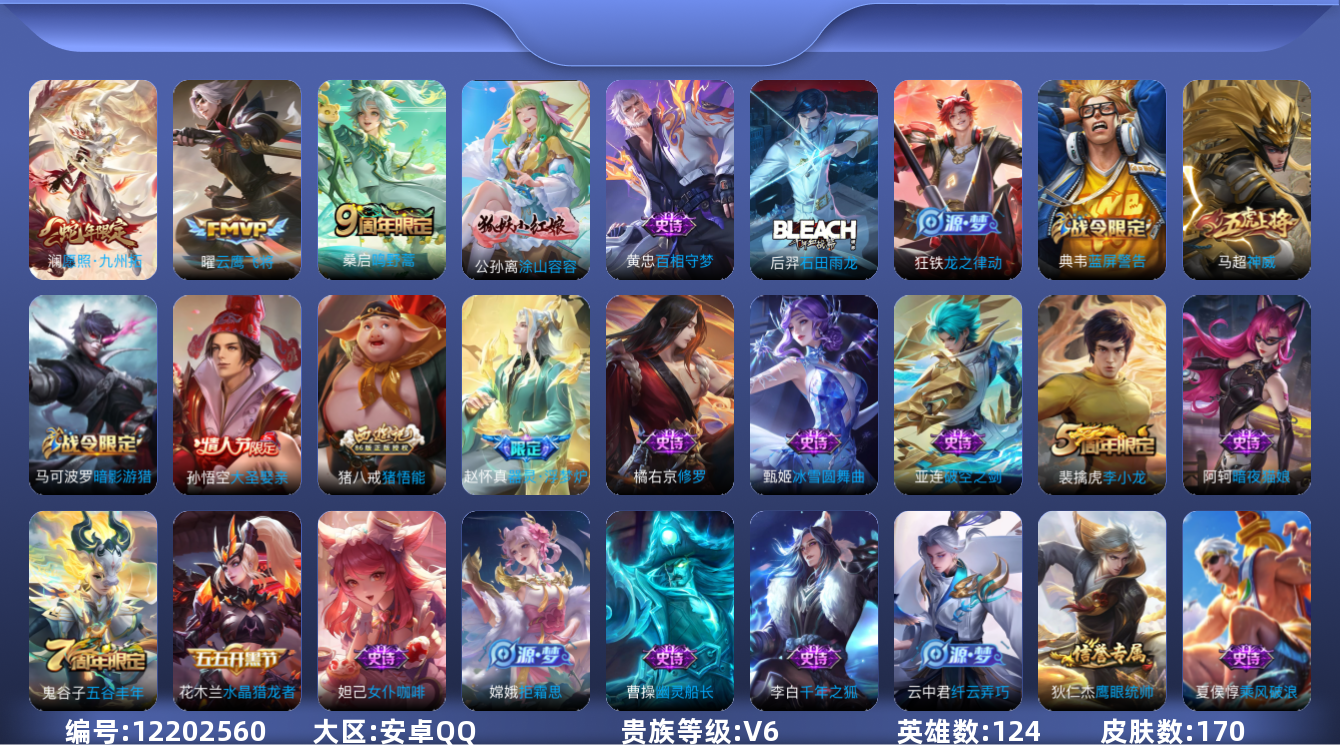 [12202560]V6 3传说 124英雄 170皮肤 可修改实名 优质装备:云鹰飞将(小将军),涂山容容 珍宝阁皮:胡桃夹子 限定皮:愿照·九州拓(澜年限),鸣野蒿,神威(电光马子),高山流水,五谷丰年,梁祝,李小龙,猪悟能,大圣娶亲 史诗皮:器灵·浮梦炉,龙之律动,石田雨龙,破空之剑,百相守梦-黄忠,黄金分割率,特工魅影,千年之狐,冰冠公主,暗夜猫娘,猫狗日记-孙策,乱世虎臣,节奏热浪,修罗,女仆咖啡,摇滚巨星,水果甜心,绅士熊喵,星夜王子,德古拉伯爵,暗隐猎兽者,幽灵船长,鬼剑武藏,纤云弄巧,繁星吟游(呼啦呼啦),拒霜思,缤纷独角兽,乘风破浪,逐浪之夏,水晶猎龙者,箭羽风息,金属风暴,圣诞恋歌,鹰眼统帅,魅力维加斯,未来纪元-赵云