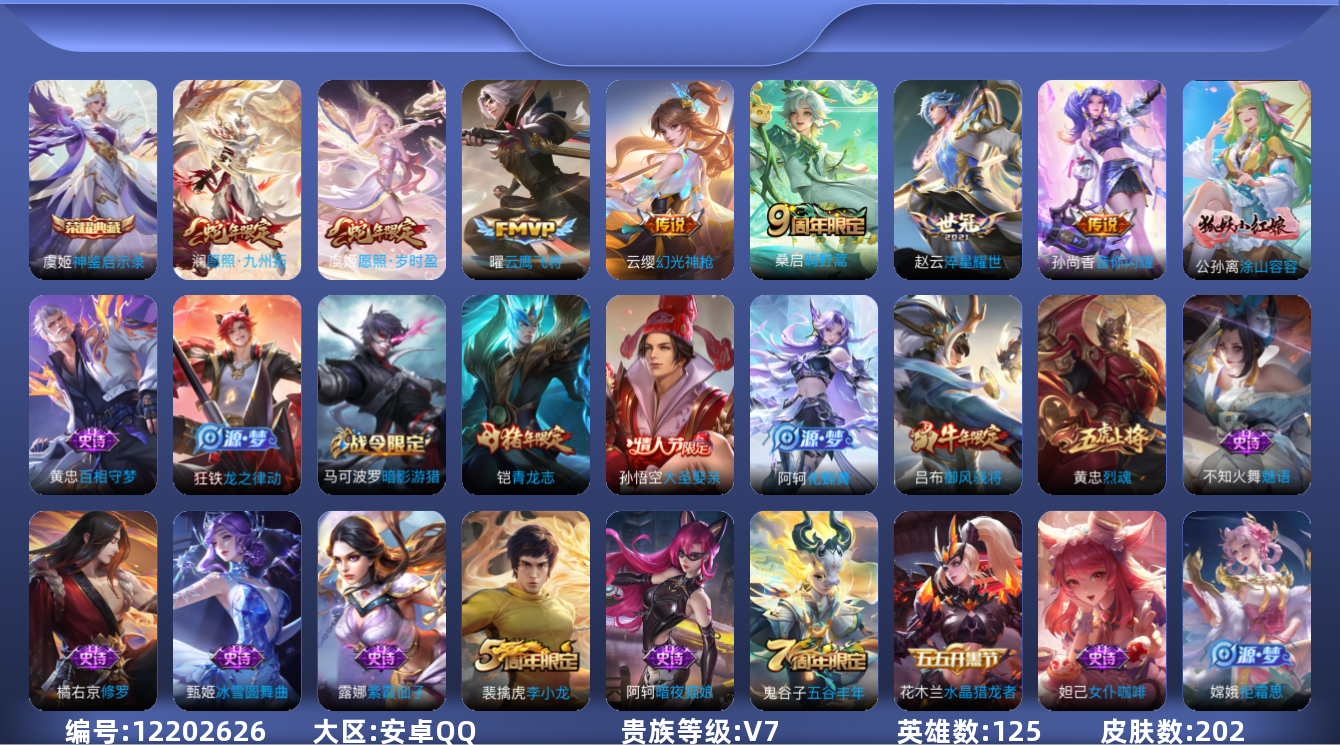 [12202626]V7 1典藏 7传说 125英雄 202皮肤 可修改实名 优质装备:神鉴启示录,云鹰飞将(小将军),淬星耀世,音你闪耀(rap皮),涂山容容 传说皮:幻光神枪 珍宝阁皮:万物之道,蔷薇恋人 限定皮:愿照·九州拓(澜年限),愿照·岁时盈(虞姬年限),鸣野蒿,高山流水,五谷丰年,青龙志(铠年限),御风骁将(吕布年限),烈魂,虎魄,李小龙,大圣娶亲 史诗皮:化蝶舞,龙之律动,百相守梦-黄忠,紫霞仙子,黄金分割率,冰冠公主,蒙恬荣光圣徽,魅语,偶像歌手,暗夜猫娘,修罗,女仆咖啡,摇滚巨星,水果甜心,天才门将,星夜王子,心灵骇客,功夫厨神,德古拉伯爵,幽灵船长,鬼剑武藏,心灵战警,舞动绿茵,地狱岩魂,纤云弄巧,拒霜思,缤纷独角兽,乘风破浪,逐浪之夏,月团寄思,水晶猎龙者,箭羽风息,金属风暴,原初追逐者,圣诞狂欢,圣诞恋歌,鹰眼统帅,王者之锤,暗夜贵公子,魅力维加斯,黎明之约,未来纪元-赵云