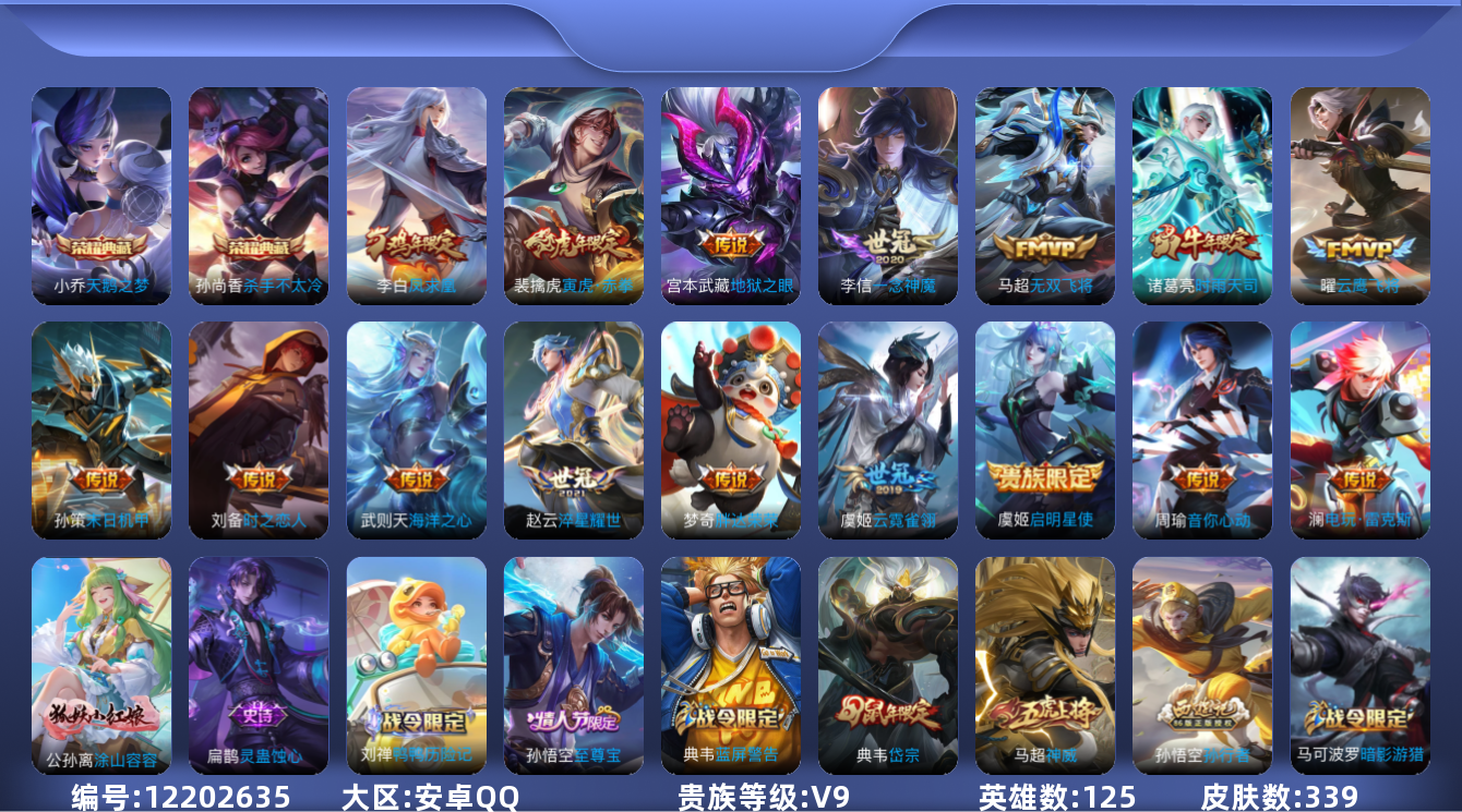 - [12279008]V7 9传说 124英雄 183皮肤 可修改实名 优质装备:黄金狮子座,冠军飞将,云鹰飞将(小将军),黄金白羊座,久胜战神,一念神魔,地狱火,地狱之眼,超时空战士-狄仁杰,涂山容容 限定皮:至尊宝,飞衡(韩信年限),梁祝,李小龙,辉光之辰,神奇女侠 史诗皮:紫霞仙子,白龙吟,黄金分割率,特工魅影,千年之狐,魅语,冰冠公主,偶像歌手,修罗,女仆咖啡,水果甜心,绅士熊喵,功夫厨神,鬼剑武藏,纤云弄巧,繁星吟游(呼啦呼啦),缤纷独角兽,乘风破浪,逐浪之夏,水晶猎龙者,金属风暴,原初追逐者,圣诞恋歌,鹰眼统帅,王者之锤,魅力维加斯