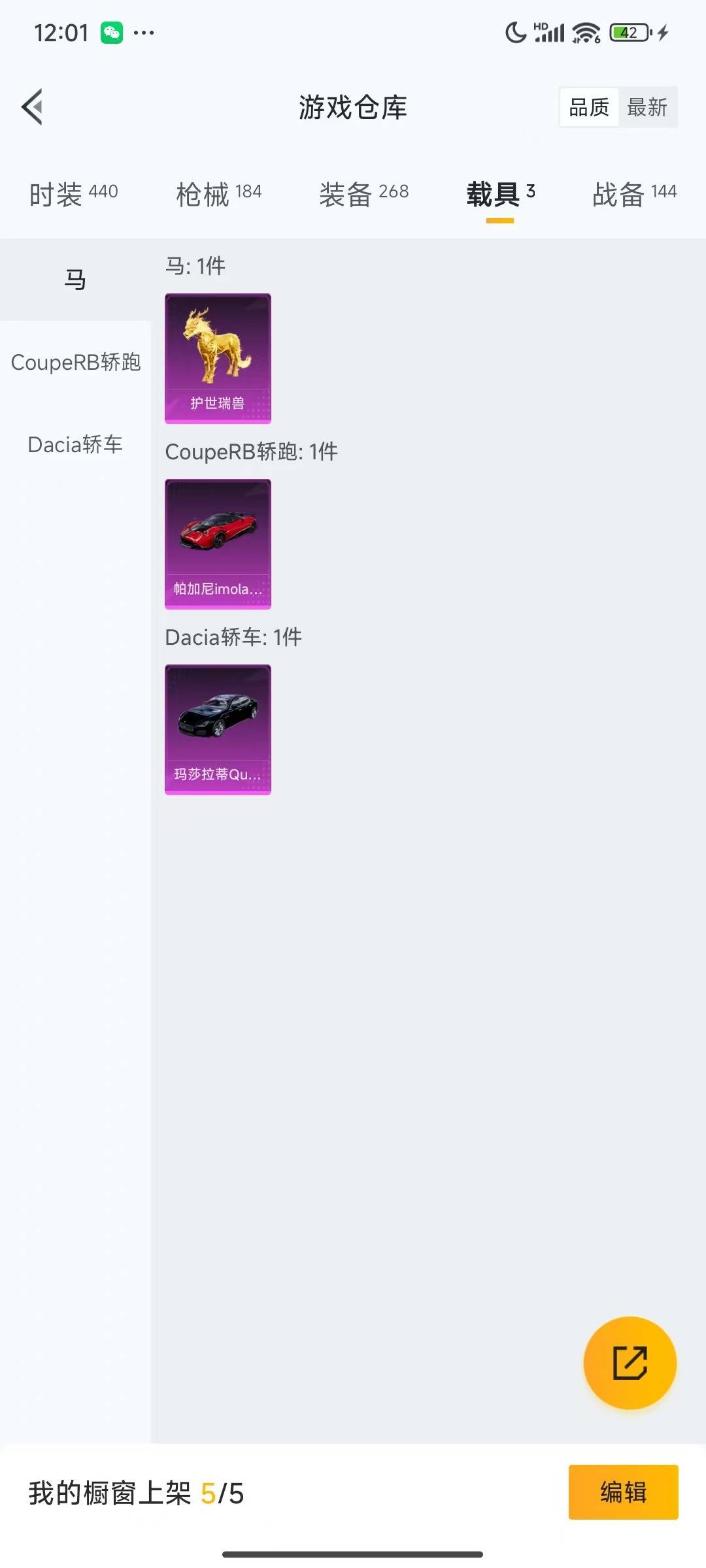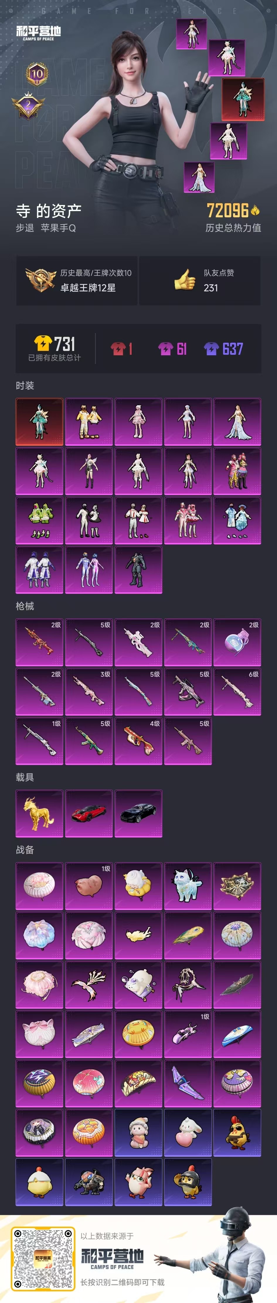 [12202649]1红装 17粉装 14特效枪 3载具 10印记 可二次 可修改实名 优质装备:辉羽雀灵-初翊,三级辉羽雀灵-初翊,帕加尼imola(光影红),护世瑞兽,玛莎拉蒂Quattroporte(夜幕蓝),Vector红伞翩翩,M416心之恋语,梦幻火箭(新101)(新火箭少女101粉色套装),缤纷油彩(猪妹猪脸妹),新星烈龙(小白龙),馨动时刻,AKM绿萝繁花,DP-28圣堂之誓,DP-28-千金淑猫,千金淑猫,GROZA-镜光银凌,MK14-盛世惊鸿,晶梦幻蝶,智耀战神,AMR-智耀战神,破片手榴弹-瓶中星球,MG3-辉羽雀灵,P90-冷漠罗丽,荧海星豚,羊梦糖心,Kar98K-巳巳如意 热门装扮:恐龙拽拽,暖熊萌萌,复仇流浪者,冰川红玫,冰川幽秘,海螺星光,茉莉星,圣堂之誓,兔兔白日梦,激萌罗小黑,浪漫波比 稀有枪皮:DP-28-豹影疾电 六级特效枪:六级DP-28-千金淑猫 五级特效枪:五级GROZA-镜光银凌,五级M416-心之恋语,五级Kar98K-巳巳如意,五级DP-28-豹影疾电,五级AKM-绿萝繁花 四级特效枪:四级Vector-红伞翩翩 三级特效枪:三级MK14-盛世惊鸿 二级特效枪:二级P90-冷漠罗丽,二级MG3-辉羽雀灵,二级AMR-智耀战神,二级破片手榴弹-瓶中星球 一级特效枪:一级DP-28-圣堂之誓 紫色装扮:SS30特训套装,SS31特训套装,云朵鹅,彩虹兔,雪绒豹,SS33特训套装,青涩时光,SS21特训,田园牧歌,轻风白浪,SS22特训,莱茵河畔,龙舌兰冰茶,顶瓜瓜,夏日音浪,幻世战舞者,萌趣咩咩,时希公主,灵公主,乐音,灵幻魔术师,娇憨猪猪,SS20特训,甜心亚梦,虚音幻奏,猎梦纪元,暖心橘喵,灵动马戏师,软羊咩咩,异彩先驱,SS18特训,智慧隐士,雪兔飞飞,飞驰魅影,音速流光,SS19特训,风暴特警,飞行日记,魅力单车,鹤鸣,龙的传人,香桃花海,霓虹极客,长空猛禽,雪山精英,炫蓝之夏,牛气冲天,探宝勇士,蓝彩潮人,狂沙舞者,猎鹰,白熊同盟,迎夏光舞,听雨铃兰,鱼渊荷华,玉兔迎春,燕燕于飞,小狗蛇点点,晶辉守护,青团波波,糖糖葫芦,棉花软糖,竞技名士,绒宝小鹅,都市丽猫,摩登魅猫,街头风暴,梦域神使,红熊茄茄,惊鸿侠骨,粉红小猪,SS25特训,绝对偶像,锦衣飞扬,湖泊玉兰,明鸳圣池,湖雨初晴,星际旅行,无暇誓言,浪漫天命,牛仔情诗,