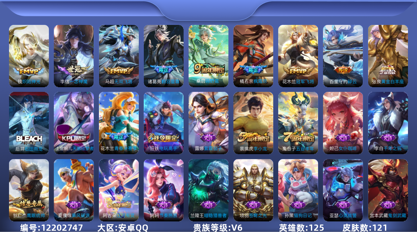 [12202747]V6 9传说 125英雄 121皮肤 可修改实名 优质装备:冠军飞将,黄金白羊座,炽阳神光,一念神魔,无双飞将,碎云,鹤羽星尊 珍宝阁皮:玩趣恶龙 限定皮:鸣野蒿,五谷丰年,天狼绘梦者,李小龙,青春决赛季,枫霜尽 史诗皮:石田雨龙,紫霞仙子,苍穹之光,千年之狐,江河有灵,冰冠公主,猫狗日记-孙策,节奏热浪,女仆咖啡,摇滚巨星,暗隐猎兽者,鬼剑武藏,心灵战警,地狱岩魂,缤纷独角兽,乘风破浪,箭羽风息,金属风暴,圣诞恋歌,鹰眼统帅,魅力维加斯