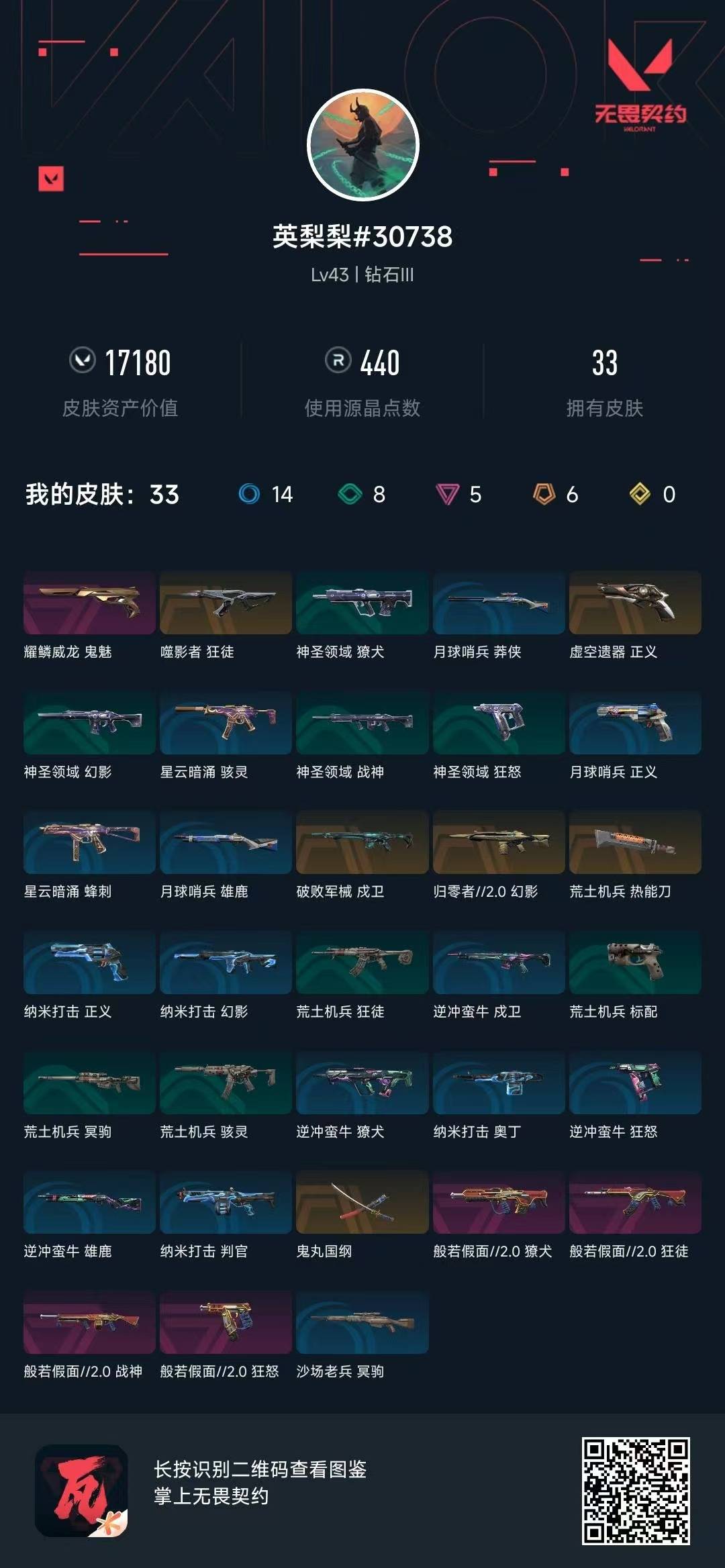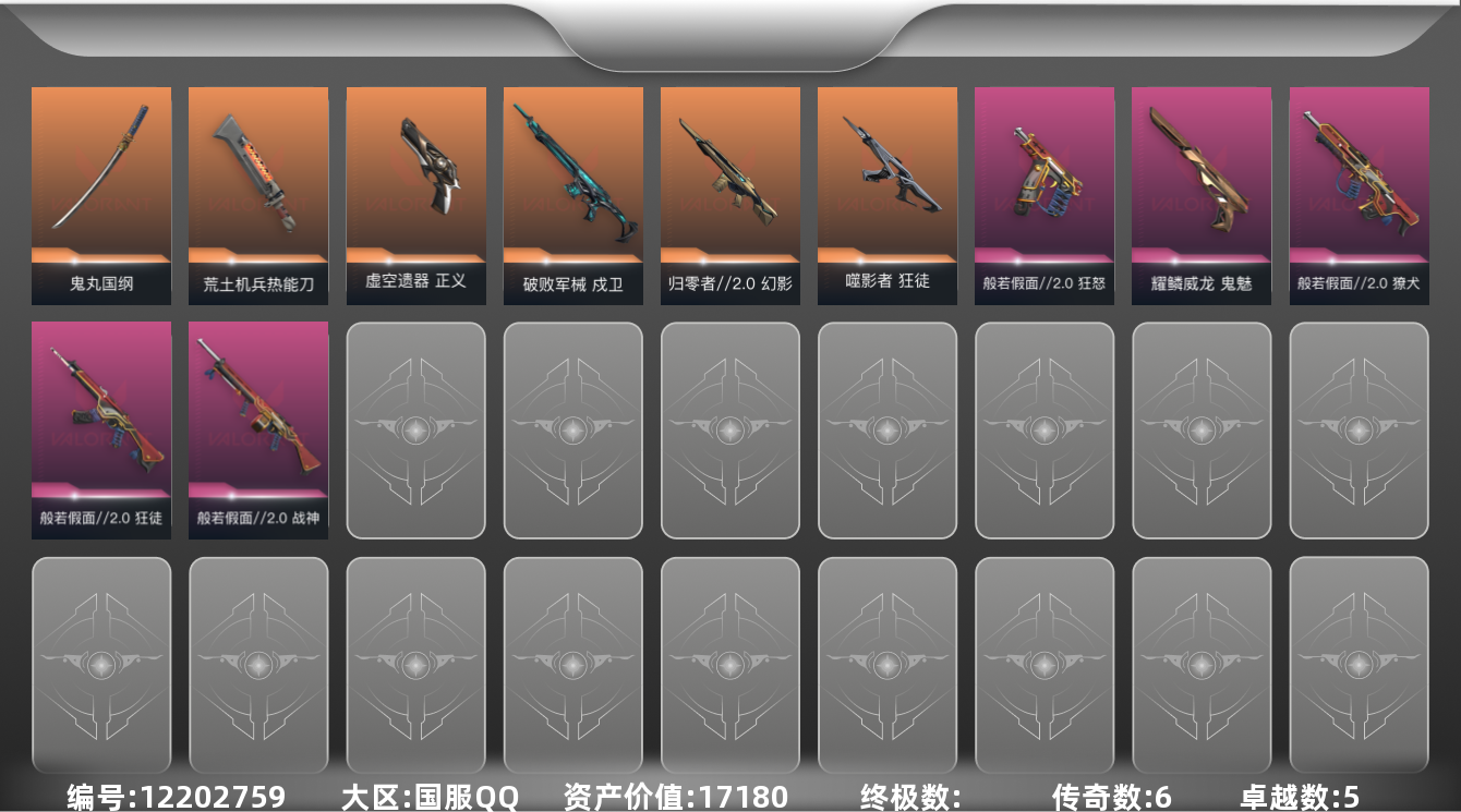 [12202759]6橙皮 5紫皮 33皮肤 15英雄 46卡面 440已用源晶 钻石 优质装备:戍卫-破败军械,荒土机兵热能刀,鬼丸国纲,鬼魅-耀鳞威龙 套装:般若假面//2.0套装 佩枪皮肤:狂怒-般若假面//2.0,正义-虚空遗器 步枪皮肤:幻影-归零者//2.0,狂徒-般若假面//2.0,狂徒-噬影者,獠犬-般若假面//2.0 机枪皮肤:战神-般若假面//2.0
