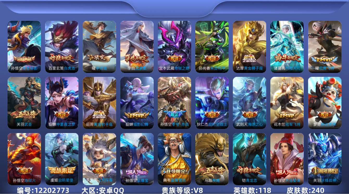 [12202773]V8 1典藏 20传说 118英雄 240皮肤 可修改实名 女号 优质装备:全息碎影(猴子典藏),黄金狮子座,黄金射手座,冠军飞将,云鹰飞将(小将军),猫影幻舞,末日机甲-孙尚香(绿蚂蚱),地狱火,仲夏夜之梦(大飞蛾),零号·赤焰,海洋之心,地狱之眼,飞鸢探春,胖达荣荣,李逍遥,超时空战士-狄仁杰 珍宝阁皮:胡桃夹子 限定皮:至尊宝,白虎志(电光耗子),凤求凰(白切鸡),凤凰于飞,时雨天司(水龙头),神威(电光马子),瑞麟志(木兰年限),遇见飞天,青龙志(铠年限),冰锋战神,武圣,游园惊梦,梁祝,天狼狩猎者,逐梦之星,李小龙,逐梦之影,朱雀志(守约年限),辉光之辰,奇迹圣诞,纯白花嫁,一生所爱,大圣娶亲,引擎之心 史诗皮:遇见神鹿,紫霞仙子,白龙吟,黄金分割率,千年之狐,冰冠公主,青蛇,暗夜猫娘,末日机甲-吕布,猫狗日记-大乔,乱世虎臣,修罗,摇滚巨星,水果甜心,心灵骇客,德古拉伯爵,幽灵船长,暗渊魔法,舞动绿茵,纤云弄巧,繁星吟游(呼啦呼啦),拒霜思,缤纷独角兽,乘风破浪,龙鼓争鸣,水晶猎龙者,热力回旋,金属风暴,圣诞狂欢,圣诞恋歌,鹰眼统帅,魅力维加斯