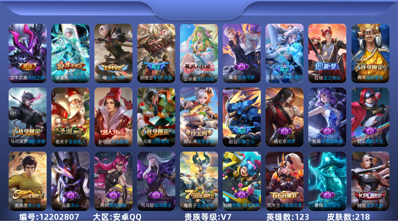 - [12029328]V7 1典藏 7传说 123英雄 222皮肤 可修改实名 优质装备:鸣剑·曳影,地狱之眼,诡秘之主,涂山容容 传说皮:九山相柳,幻光神枪 珍宝阁皮:万物之道,蔷薇恋人 限定皮:愿照·九州拓(澜年限),鸣野蒿,五谷丰年,李小龙,永曜之星,辉光之辰 史诗皮:化蝶舞,星界战将,龙之律动,石田雨龙,百相守梦-周瑜,茶境仙,破空之剑,蒙犽顽岩魄,上官婉儿群星魔术团,蔬乡物语(鲁班七号),百相守梦-黄忠,织梦人,守夜人,紫霞仙子,特工魅影,千年之狐,江河有灵,百解令(蒙犽),高渐离燃音魔法,蒙恬荣光圣徽,冰冠公主,青蛇,偶像歌手,电玩·爆裂旋风,末日机甲-吕布,猫狗日记-孙策,节奏热浪,女仆咖啡,水果甜心,天才门将,星夜王子,功夫厨神,德古拉伯爵,暗隐猎兽者,幽灵船长,鬼剑武藏,心灵战警,纤云弄巧,拒霜思,缤纷独角兽,乘风破浪,逐浪之夏,水晶猎龙者,曙光守护者,箭羽风息,金属风暴,原初追逐者,圣诞恋歌,鹰眼统帅,魅力维加斯,无心,未来纪元-赵云