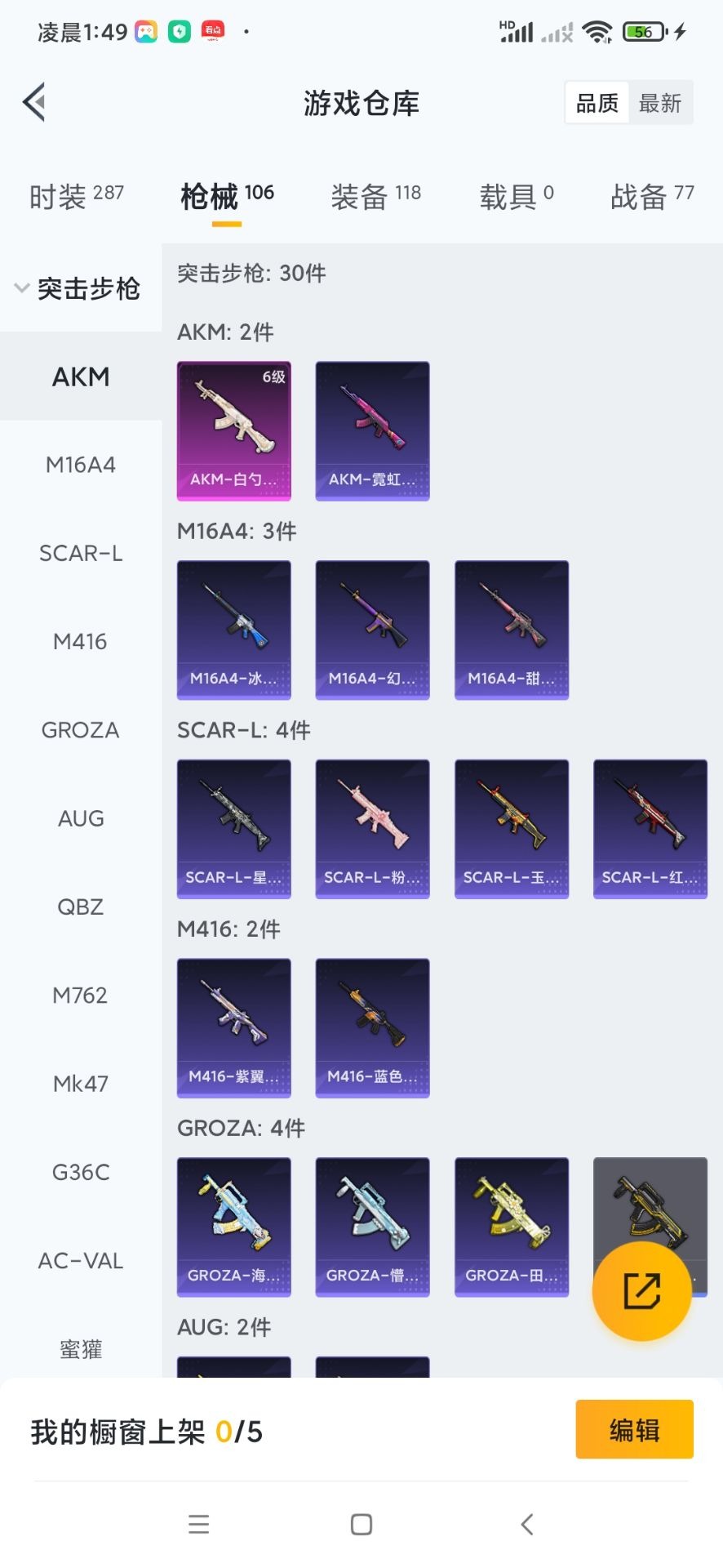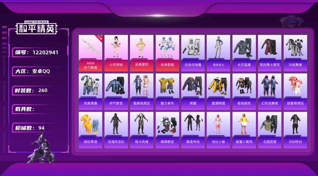 - PX_2104844- 苹果手Q-20王牌印记-14粉装-10特效枪-1载具-89435热力值-197套装-264枪皮-1卓越印记-1传奇印记 【14粉装】,梦幻火箭,天使彩虹糖,缤纷油彩,蓝莓炮弹,深海曼妙,迷蝶贵族,炙焰牛王,向日葵,霞光圣骑,寒光使者,冰霜白皇,绚金战神,香水柠檬,星之彼岸 【10特效枪】AKM-炫紫旋律-6级 SCAR-L-梦幻火箭-6级 M416-五爪金龙-1级 M416