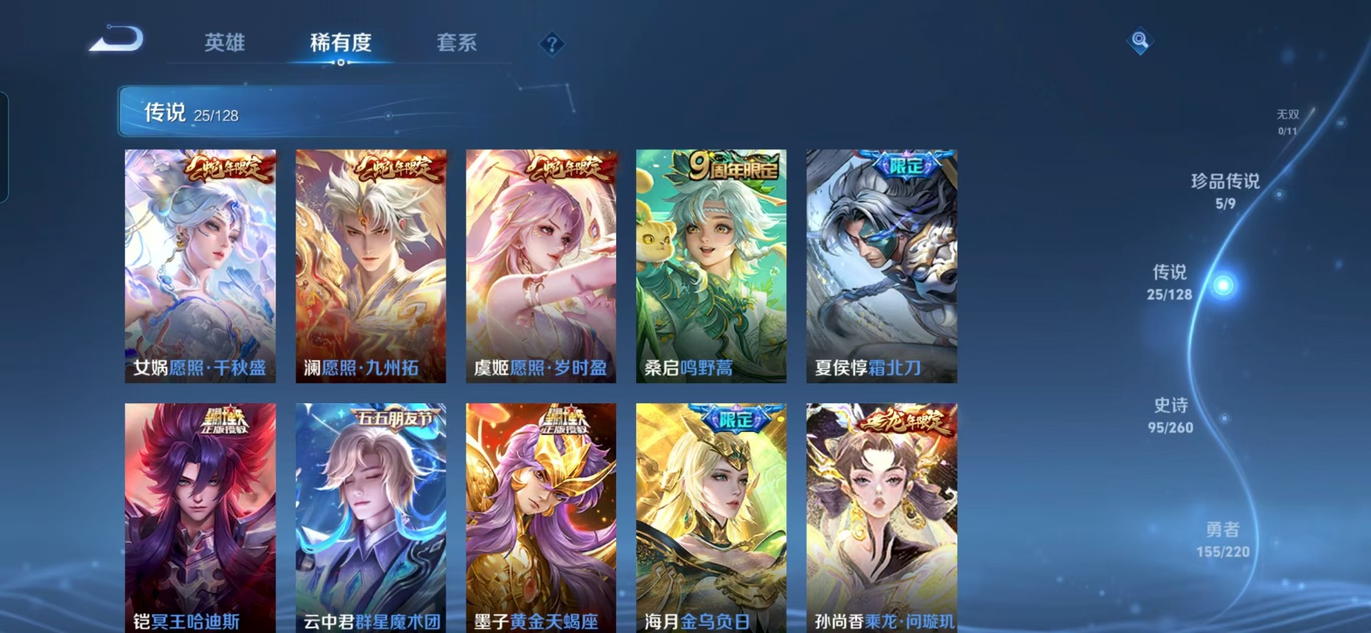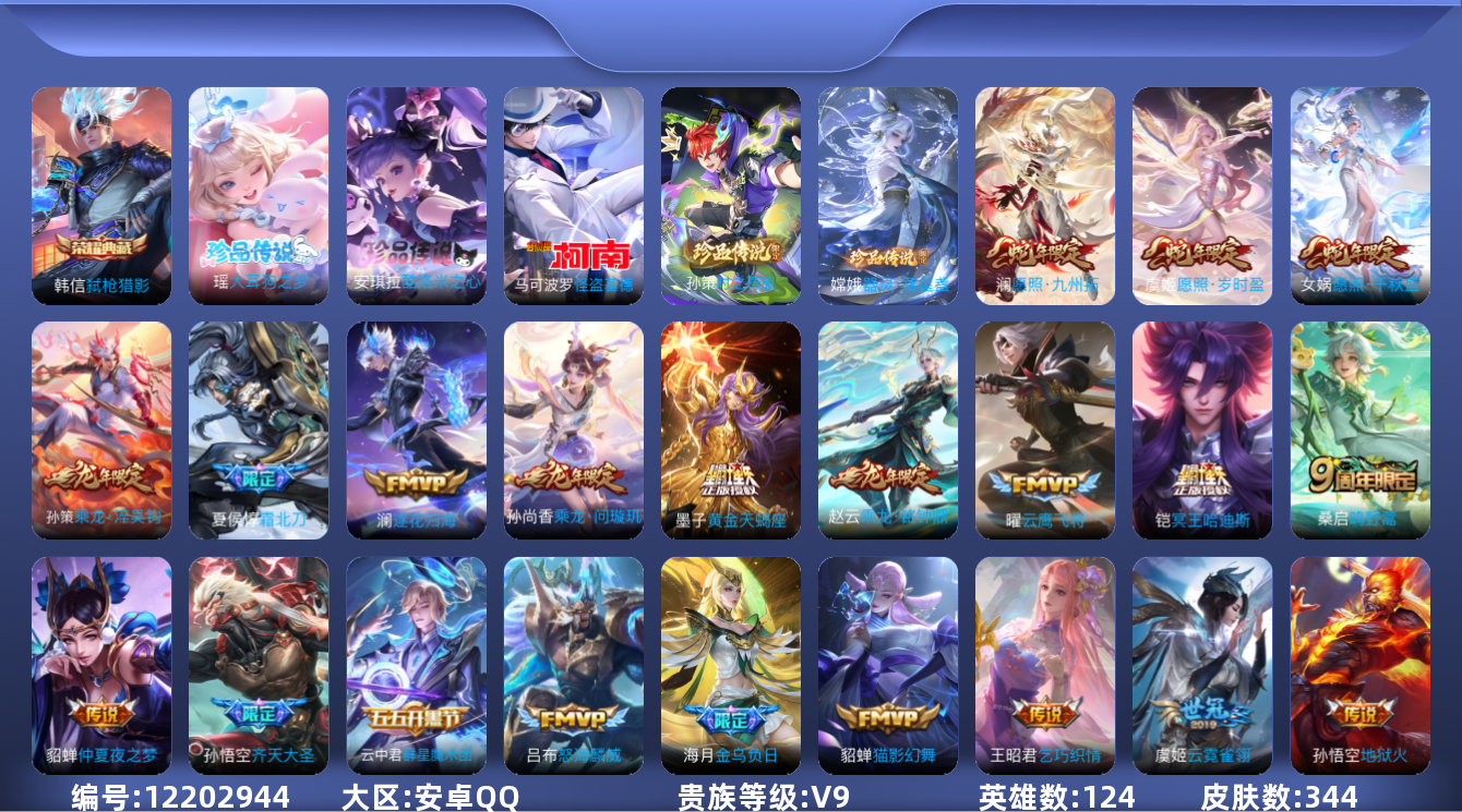 [12202944]V9 1典藏 5珍品传说 25传说 124英雄 344皮肤 可修改实名 优质装备:弑枪猎影(韩信典藏),怪盗基德,器灵·落星盏,酷洛米之心,大耳狗之梦,云鹰飞将(小将军),绛天战甲(鸡嘴战神),猫影幻舞,云霓雀翎,地狱火,仲夏夜之梦(大飞蛾),飞鸢探春,音你心动-周瑜,乞巧织情,澜逐花归海,金乌负日,黄金天蝎座,云中君群星魔术团 珍品传说:时之奇旅-孙策 传说皮:乘龙·问璇玑(孙尚香年限),乘龙·铭钟鼎(赵云年限),乘龙·淬吴钩(孙策年限),铠冥王哈迪斯 珍宝阁皮:妄想食味,玩趣恶龙 限定皮:愿照·九州拓(澜年限),愿照·岁时盈(虞姬年限),愿照·千秋盛(女娲年限),逐霄战戟,鸣野蒿,夏侯惇霜北刀,魔法小厨娘,神威(电光马子),高山流水,齐天大圣,怒海麟威,五谷丰年,青龙志(铠年限),李小龙,孙行者,大圣娶亲,百木心枪,山海·玄木吟(马可年限) 史诗皮:鸭鸭历险记-刘禅,飞车小橘子,器灵·浮梦炉,化蝶舞,星界战将,龙之律动,茶境仙,破空之剑,战舞者,东方月初,蒙犽顽岩魄,埋骨钱,海诺心动手记,上官婉儿群星魔术团,蔬乡物语(鲁班七号),乘龙·聚宝船(安琪拉年限),乘龙·忆丹青(大乔年限),百相守梦-百里守约,百相守梦-黄忠,织梦人,遇见神鹿,紫霞仙子,白龙吟,黄金分割率,千年之狐,永昼,江河有灵,百解令(蒙犽),高渐离燃音魔法,蒙恬荣光圣徽,青蛇,偶像歌手,晚萤,电玩·爆裂旋风,末日机甲-吕布,猫狗日记-孙策,时之恋人-孙尚香,乱世虎臣,节奏热浪,女仆咖啡,摇滚巨星,水果甜心,绅士熊喵,星夜王子,心灵骇客,功夫厨神,德古拉伯爵,暗隐猎兽者,幽灵船长,鬼剑武藏,暗渊魔法,心灵战警,天秀·启明,舞动绿茵,地狱岩魂,纤云弄巧,拒霜思,缤纷独角兽,乘风破浪,逐浪之夏,月团寄思,水晶猎龙者,曙光守护者,热力回旋,唤灵魅影,金属风暴,圣诞狂欢,圣诞恋歌,鹰眼统帅,魅力维加斯,赏金猎手,未来纪元-赵云