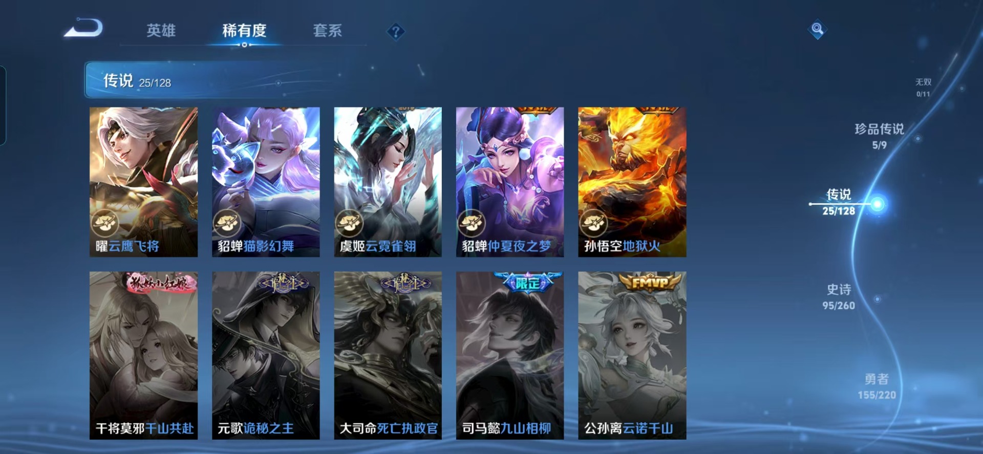 铠绛天战甲,铠冥王哈迪斯,赵云乘龙·铭钟鼎,孙策乘龙·淬吴钩,孙尚香乘龙·问璇玑,海月金乌负日,王昭君乞巧织情,周瑜音你心动,貂蝉猫影幻舞,曜云鹰飞将,云中君群星魔术团,李元芳飞鸢探春,墨子黄金天蝎座,澜逐花归海,虞姬云霓雀翎