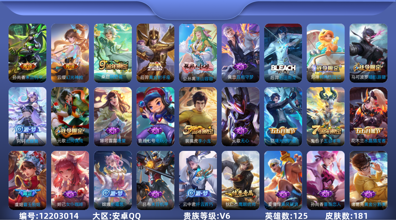 [12203014]V6 4传说 125英雄 181皮肤 可修改实名 优质装备:黄金射手座,末日机甲-孙尚香(绿蚂蚱),涂山容容 传说皮:幻光神枪 珍宝阁皮:优雅恋人,蔷薇恋人 限定皮:鸣野蒿,遇见飞天,高山流水,五谷丰年,游园惊梦,梁祝,李小龙,霸王别姬-虞姬 史诗皮:鸭鸭历险记-刘禅,化蝶舞,石田雨龙,茶境仙,百相守梦-黄忠,电玩小子(小书包),黄金分割率,特工魅影,江河有灵,百解令(蒙犽),冰冠公主,偶像歌手,晚萤,末日机甲-吕布,猫狗日记-孙策,乱世虎臣,女仆咖啡,水果甜心,绅士熊喵,功夫厨神,暗隐猎兽者,鬼剑武藏,天秀·启明,纤云弄巧,繁星吟游(呼啦呼啦),拒霜思,缤纷独角兽,乘风破浪,逐浪之夏,水晶猎龙者,曙光守护者,热力回旋,箭羽风息,原初追逐者,圣诞狂欢,圣诞恋歌,鹰眼统帅,王者之锤,魅力维加斯,无心,未来纪元-赵云