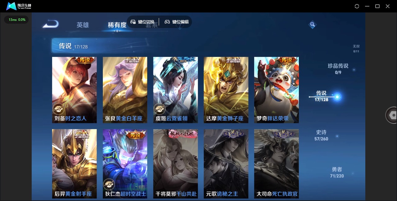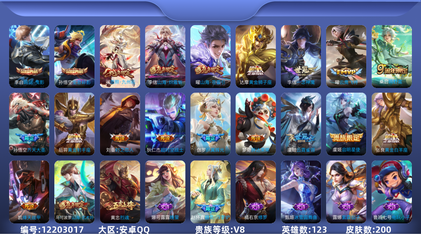 [12203017]V8 2典藏 17传说 123英雄 200皮肤 可修改实名 优质装备:鸣剑·曳影,全息碎影(猴子典藏),黄金狮子座,黄金射手座,云鹰飞将(小将军),绛天战甲(鸡嘴战神),黄金白羊座,一念神魔,云霓雀翎,胖达荣荣,时之恋人-刘备(电焊工),超时空战士-狄仁杰,山海·炽霜斩(李信年限),山海·苍雷引(电光曜子),炽翼辉光(娃娃菜牛角包) 珍宝阁皮:女武神 限定皮:愿照·九州拓(澜年限),鸣野蒿,齐天大圣,降魔,烈魂,李小龙,山海·玄木吟(马可年限) 史诗皮:器灵·浮梦炉,星界战将,紫霞仙子,电玩小子(小书包),白龙吟,黄金分割率,特工魅影,千年之狐,永昼,江河有灵,蒙恬荣光圣徽,无限星赏官,偶像歌手,晚萤,末日机甲-吕布,猫狗日记-孙策,猫狗日记-大乔,时之恋人-孙尚香,乱世虎臣,节奏热浪,修罗,女仆咖啡,摇滚巨星,绅士熊喵,心灵骇客,功夫厨神,德古拉伯爵,暗隐猎兽者,幽灵船长,鬼剑武藏,暗渊魔法,天秀·启明,舞动绿茵,地狱岩魂,缤纷独角兽,乘风破浪,逐浪之夏,龙鼓争鸣,水晶猎龙者,曙光守护者,热力回旋,唤灵魅影,金属风暴,圣诞狂欢,鹰眼统帅,暗夜贵公子,赏金猎手,无心,未来纪元-赵云