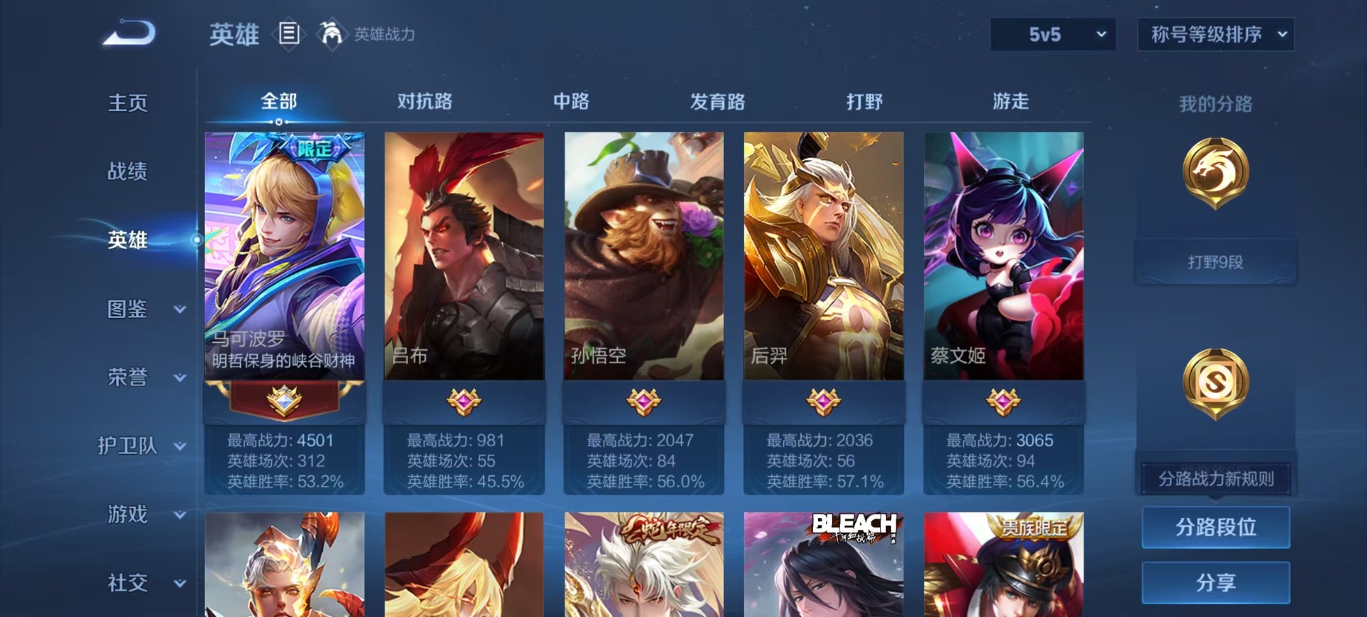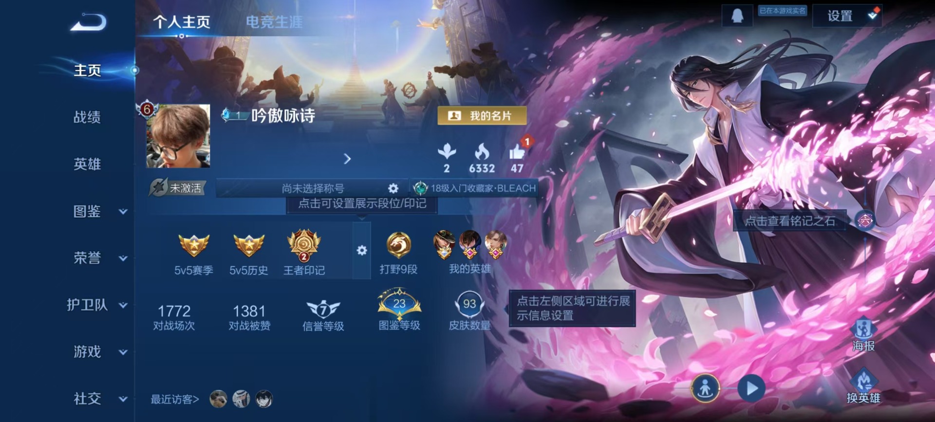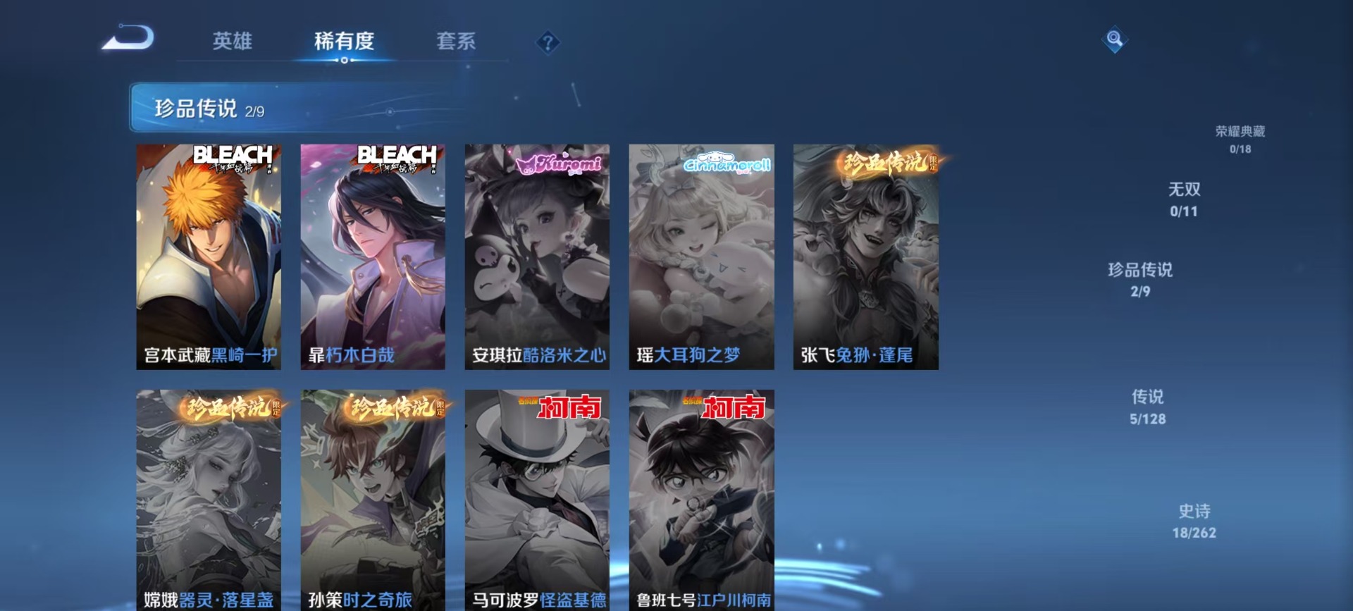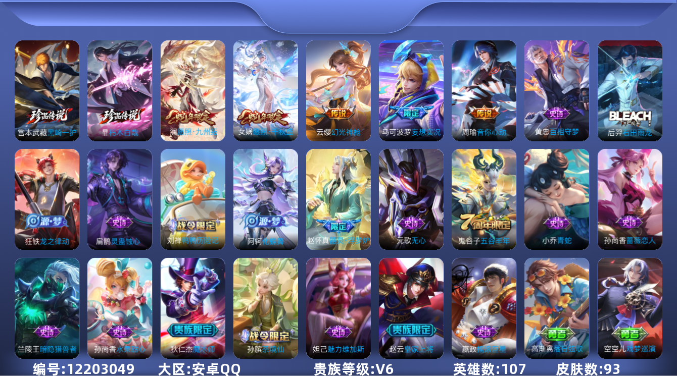 [12203049]V6 2珍品传说 5传说 107英雄 93皮肤 可修改实名 优质装备:朽木白哉,黑崎一护,音你心动-周瑜,妄想实况 传说皮:幻光神枪 珍宝阁皮:蔷薇恋人 限定皮:愿照·九州拓(澜年限),愿照·千秋盛(女娲年限),五谷丰年 史诗皮:鸭鸭历险记-刘禅,器灵·浮梦炉,化蝶舞,龙之律动,灵蛊蚀心,石田雨龙,茶境仙,百相守梦-黄忠,青蛇,摇滚巨星,水果甜心,暗隐猎兽者,魅力维加斯,无心