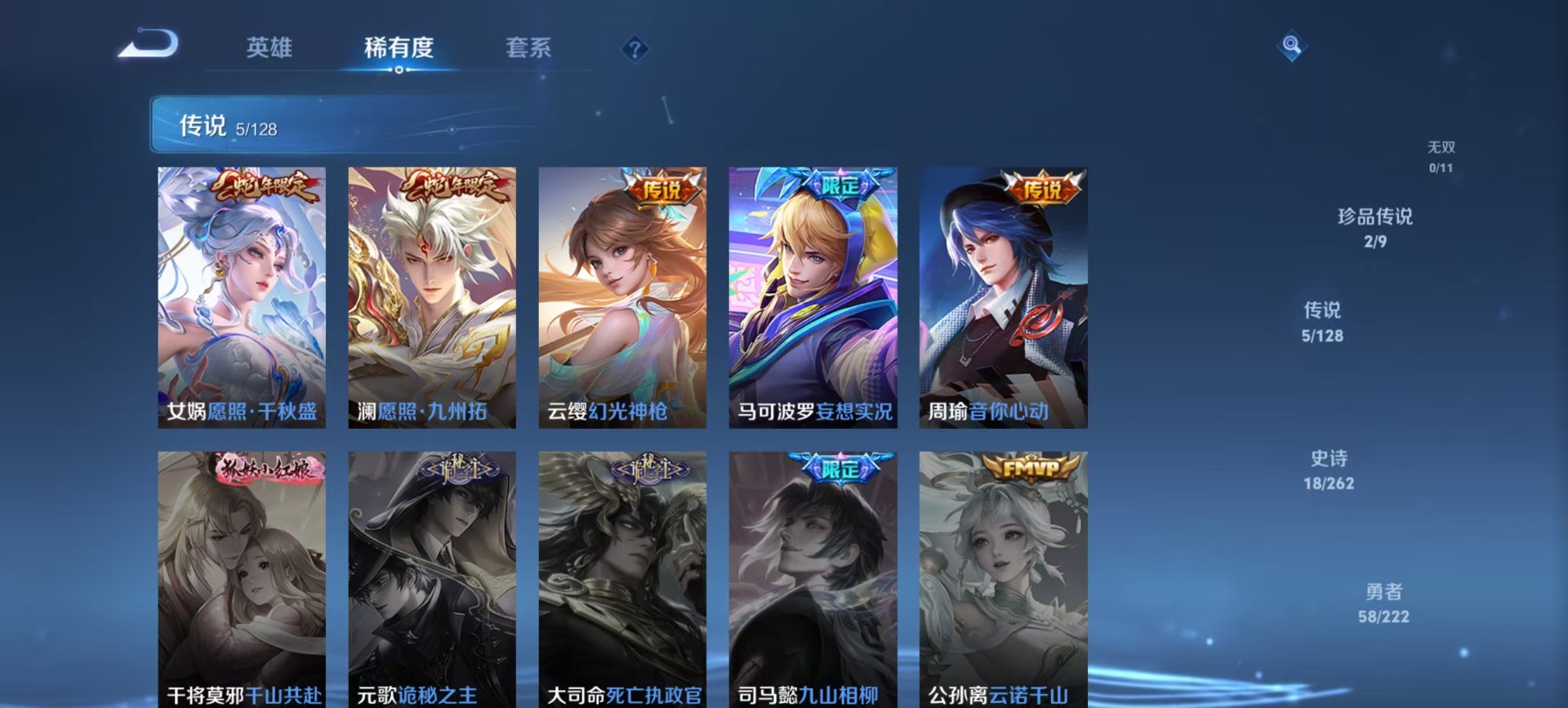 - PX_2096165-49 安卓QQ/荣耀黄金/228皮肤/121英雄/3典藏/0珍品无双/0无双/0珍品传说/7传说/62史诗/7稀有英雄 【3 典藏皮肤】全息碎影 孙悟空,九霄神辉 花木兰,大秦宣太后 芈月, 【7 传说皮肤】启明星使 虞姬,云鹰飞将 曜,仲夏夜之梦 貂蝉,武陵仙君 诸葛亮,炽阳神光 镜,无尽星芒 后羿,绯月行 不知火舞, 【62 史诗皮肤】百解令 蒙犽,银河之约 李元芳,奇遇