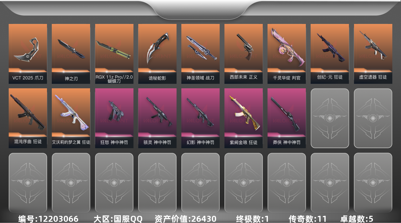 [12203066]11橙皮 1金皮 5紫皮 56皮肤 27英雄 102卡面 865已用源晶 铂金 优质装备:狂徒-艾沃莉的梦之翼,狂徒-混沌序曲,狂徒-紫阙金琅,判官-千灵华绽,神圣领域 战刀,RGX 11z Pro//2.0 蝴蝶刀,VCT 2025 爪刀,诡秘蛇影,神之刃 套装:神罚套装,神中神罚套装,VCT 2025赛季礼包,VCTCN2025套装 佩枪皮肤:狂怒-神中神罚,正义-西部未来 冲锋枪皮肤:骇灵-神中神罚 步枪皮肤:狂徒-创·纪元,狂徒-虚空遗器,幻影-神中神罚 狙击枪皮肤:莽侠-神中神罚