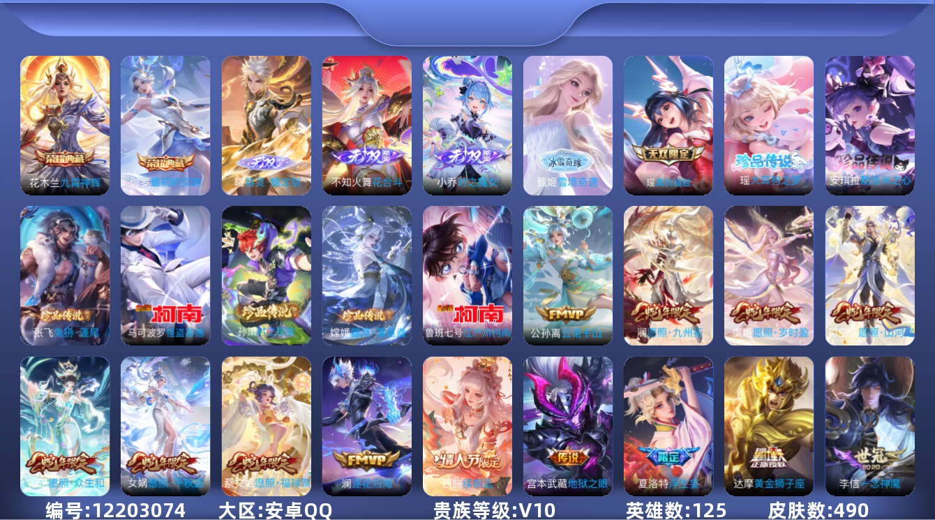 [12203074]V10 2典藏 5无双 7珍品传说 54传说 125英雄 490皮肤 可修改实名 优质装备:九霄神辉(木兰典藏),真我赫兹(瑶)(瑶无双),小乔时之魔女(小乔无双),花合斗,雪境奇遇-甄姬,器灵·螭龙剑,最初的交响(伽罗典藏),江户川柯南,怪盗基德,器灵·落星盏,酷洛米之心,大耳狗之梦,黄金狮子座,黄金射手座,云鹰飞将(小将军),绛天战甲(鸡嘴战神),黄金白羊座,久胜战神,一念神魔,云霓雀翎,仲夏夜之梦(大飞蛾),地狱之眼,飞鸢探春,音你心动-周瑜,乞巧织情,游龙清影(小青龙),淬星耀世,超时空战士-狄仁杰,末日机甲-孙策,碎云,画中仙,浮生妄,电玩·雷克斯,鹤羽星尊,灼幽烈阳,妄想实况,惊梅引,小动物乐团,霜月吟,澜逐花归海,艾琳觅芳踪,牧神诗旅,玄雷天君,千劫归真 珍品传说:时之奇旅-孙策,兔狲·蓬尾 传说皮:典韦战鼓燎原,云诺千山,铠冥王哈迪斯,续相思,星之鸣奏,祥瑞亨通,幻光神枪 珍宝阁皮:妄想食味,胡桃夹子,女武神 限定皮:愿照·九州拓(澜年限),愿照·福禄聚(蔡文姬年限),愿照·岁时盈(虞姬年限),愿照·山河定(司空震年限),愿照·众生和(妲己年限),愿照·千秋盛(女娲年限),逐霄战戟,映山客,陌上桑,鸣野蒿,至尊宝,异界灵契(白毛香),傲雪梅枪,绯月行,时之彼端,魔法小厨娘,时雨天司(水龙头),神威(电光马子),高山流水,诗剑行,齐天大圣,怒海麟威,降魔,五谷丰年,青龙志(铠年限),冰锋战神,梁祝,御风骁将(吕布年限),烈魂,岱宗(典韦年限),天狼溯光者,虎魄,逐梦之音,李小龙,朱雀志(守约年限),孙行者,猪悟能,大圣娶亲,引擎之心,乒乒小将,蜜橘之夏,匿光追影者,神器·万象笔,山海·玄木吟(马可年限),冰霜神祇 史诗皮:鸭鸭历险记-刘禅,飞车小橘子,苍鳞隐世,器灵·浮梦炉,糖绘人间,狼魂孤将,绮世丹青,瑰影绮梦,化蝶舞,灵蛊蚀心,星界战将,谪仙醉月,龙之律动,雪豹·霜爪,藏狐·褐绒,布丁狗之誓,石田雨龙,茶境仙,怒海争锋,炽弈燎原,破空之剑,战舞者,涂山红红,东方月初,蒙犽顽岩魄,埋骨钱,芈月浮光幕影,海诺心动手记,夜落电台,决胜骁骑,百相守梦-百里守约,星界特工,百相守梦-黄忠,遇见神鹿,紫霞仙子,苍穹之光,电玩小子(小书包),白龙吟,黄金分割率,特工魅影,千年之狐,永昼,匿光侦查者,末日机甲-莱西奥,真我赫兹(百里守约),完美假期,闲日渔趣,