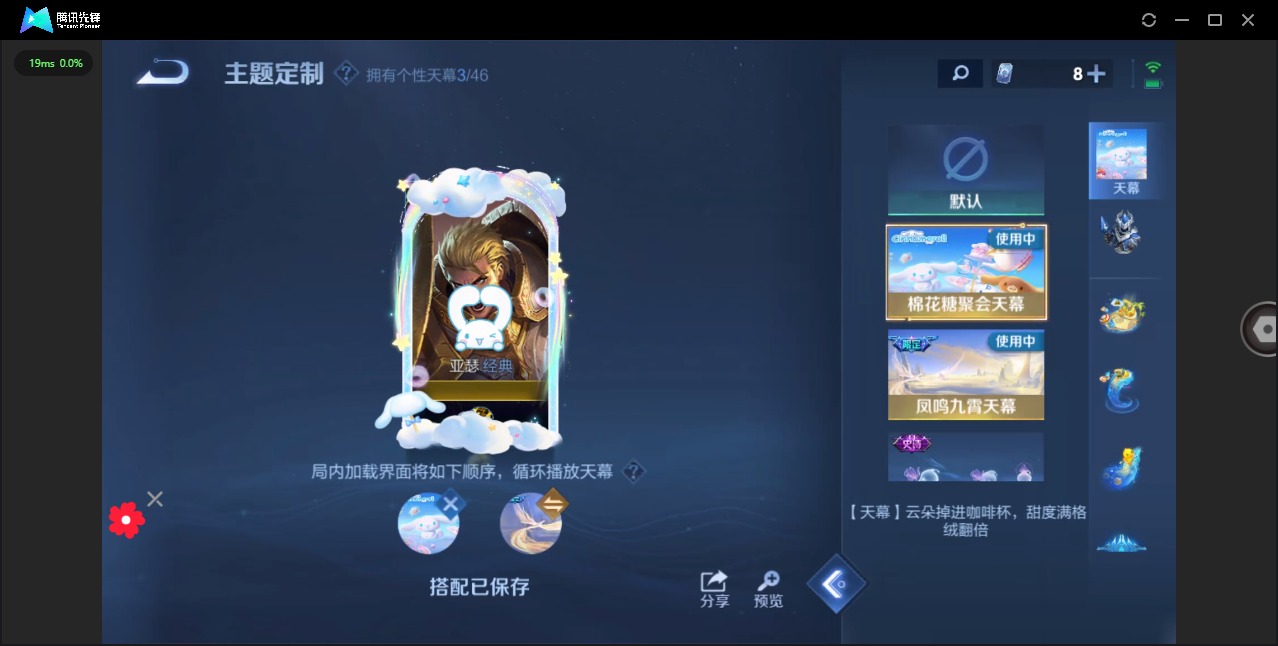铠绛天战甲,铠冥王哈迪斯,孙膑小动物乐团,赵云淬星耀世,干将莫邪久胜战神,典韦战鼓燎原,干将莫邪画中仙,李信一念神魔,孙策末日机甲,达摩黄金狮子座,王昭君乞巧织情,露娜霜月吟,后羿千劫归真,庄周牧神诗旅,周瑜音你心动,杨玉环星之鸣奏,宫本武藏惊梅引,裴擒虎祥瑞亨通,夏洛特浮生妄,艾琳觅芳踪,西施游龙清影,西施续相思,嬴政玄雷天君,张良黄金白羊座,曜云鹰飞将,李元芳飞鸢探春,百里守约碎云,澜逐花归海,虞姬云霓雀翎,云缨幻光神枪