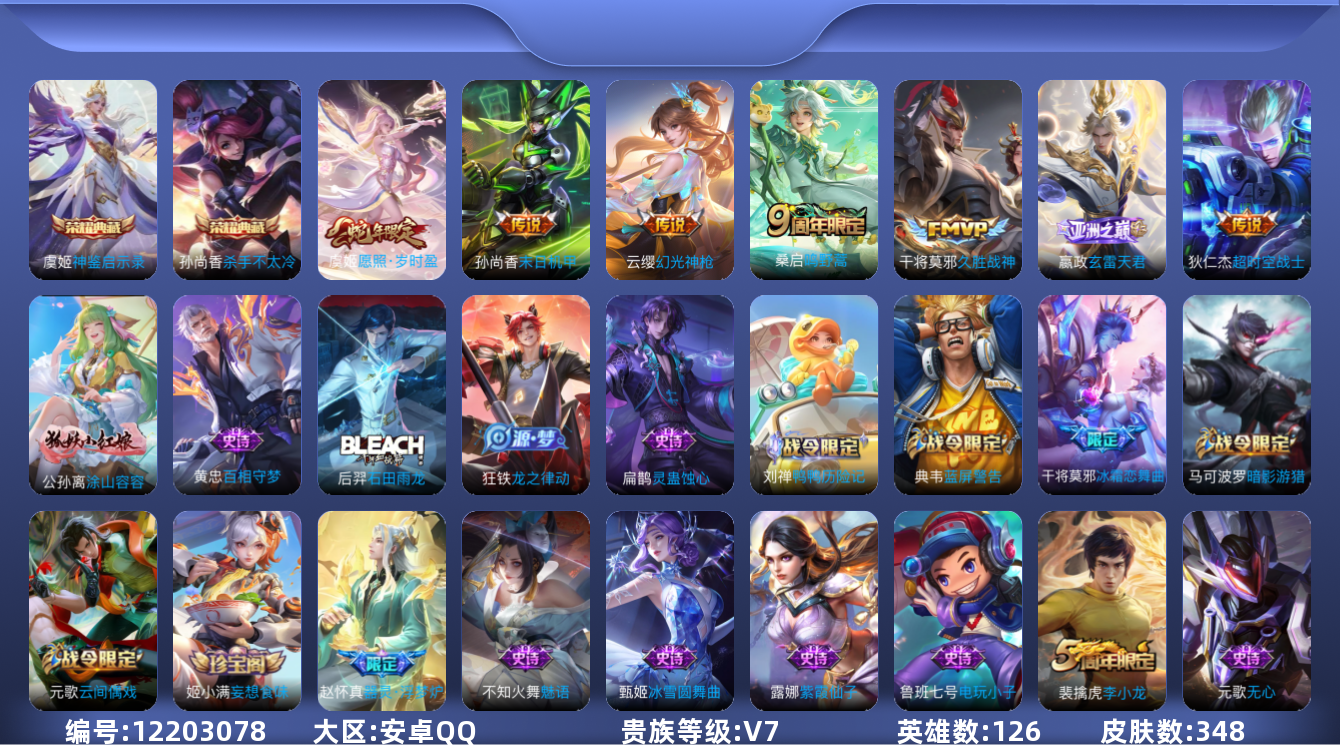 [12203078]V7 2典藏 7传说 126英雄 348皮肤 典藏英雄武则天 可修改实名 优质装备:杀手不太冷,神鉴启示录,久胜战神,末日机甲-孙尚香(绿蚂蚱),超时空战士-狄仁杰,玄雷天君,涂山容容 传说皮:幻光神枪 珍宝阁皮:妄想食味,优雅恋人,蔷薇恋人,女武神 限定皮:愿照·岁时盈(虞姬年限),逐霄战戟,鸣野蒿,遇见飞天,高山流水,五谷丰年,游园惊梦,梁祝,李小龙,如梦令-后羿,霸王别姬-虞姬,冰霜恋舞曲 史诗皮:鸭鸭历险记-刘禅,器灵·浮梦炉,灵蛊蚀心,星界战将,龙之律动,石田雨龙,怒海争锋,蔬乡物语(鲁班七号),百相守梦-百里守约,百相守梦-黄忠,紫霞仙子,苍穹之光,电玩小子(小书包),白龙吟,黄金分割率,特工魅影,千年之狐,永昼,江河有灵,魅语,高渐离燃音魔法,蒙恬荣光圣徽,偶像歌手,暗夜猫娘,龙骑士(小龙虾),末日机甲-吕布,猫狗日记-孙策,猫狗日记-大乔,时之恋人-孙尚香,乱世虎臣,节奏热浪,女仆咖啡,摇滚巨星,水果甜心,绅士熊喵,天才门将,星夜王子,心灵骇客,功夫厨神,德古拉伯爵,暗隐猎兽者,幽灵船长,鬼剑武藏,心灵战警,天秀·启明,舞动绿茵,地狱岩魂,纤云弄巧,繁星吟游(呼啦呼啦),拒霜思,缤纷独角兽,乘风破浪,逐浪之夏,月团寄思,水晶猎龙者,曙光守护者,箭羽风息,金属风暴,原初追逐者,圣诞狂欢,圣诞恋歌,鹰眼统帅,暗夜贵公子,魅力维加斯,黎明之约,无心,未来纪元-赵云