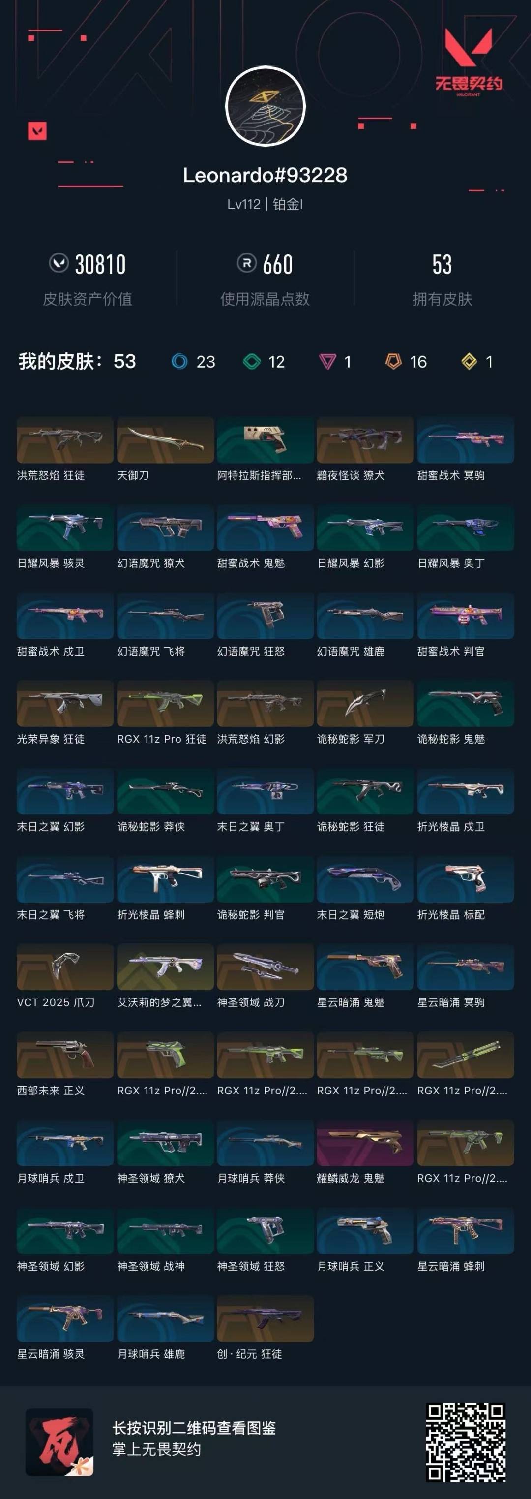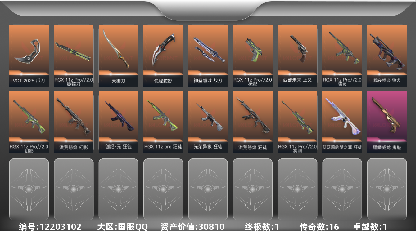 [12203102]16橙皮 1金皮 1紫皮 53皮肤 22英雄 71卡面 660已用源晶 铂金 优质装备:狂徒-艾沃莉的梦之翼,幻影-洪荒怒焰,狂徒-洪荒怒焰,天御刀,神圣领域 战刀,RGX 11z Pro//2.0 蝴蝶刀,VCT 2025 爪刀,诡秘蛇影,鬼魅-耀鳞威龙 套装:VCT 2025赛季礼包,RGX 11z Pro//2.0,VCTCN2025套装 佩枪皮肤:标配-RGX 11z Pro//2.0,正义-西部未来 冲锋枪皮肤:骇灵-RGX 11z Pro//2.0 步枪皮肤:幻影-RGX 11z Pro//2.0,狂徒-创·纪元,獠犬-黯夜怪谈,狂徒-光荣异象,RGX 11z pro 狂徒 狙击枪皮肤:冥驹-RGX 11z Pro//2.0
