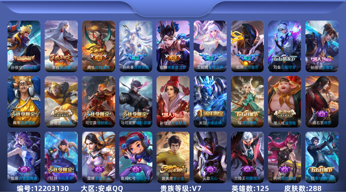 [12203130]V7 1典藏 6传说 125英雄 288皮肤 可修改实名 优质装备:全息碎影(猴子典藏),仲夏夜之梦(大飞蛾) 传说皮:典韦战鼓燎原 珍宝阁皮:优雅恋人,蔷薇恋人,玩趣恶龙 限定皮:至尊宝,凤求凰(白切鸡),异界灵契(白毛香),星穹之声,魔法小厨娘,遇见飞天,高山流水,五谷丰年,冰锋战神,游园惊梦,梁祝,天狼溯光者,李小龙,孙行者,猪悟能,大圣娶亲,美猴王,无尽星芒,神器·万象笔 史诗皮:怒海争锋,遇见神鹿,紫霞仙子,电玩小子(小书包),黄金分割率,特工魅影,千年之狐,江河有灵,百解令(蒙犽),高渐离燃音魔法,匿光破解者,冰冠公主,青蛇,百相守梦(刘备),暗夜猫娘,龙骑士(小龙虾),猫狗日记-孙策,猫狗日记-大乔,乱世虎臣,节奏热浪,修罗,女仆咖啡,摇滚巨星,水果甜心,绅士熊喵,天才门将,星夜王子,心灵骇客,功夫厨神,德古拉伯爵,暗隐猎兽者,幽灵船长,鬼剑武藏,心灵战警,舞动绿茵,地狱岩魂,纤云弄巧,繁星吟游(呼啦呼啦),拒霜思,缤纷独角兽,乘风破浪,逐浪之夏,水晶猎龙者,曙光守护者,箭羽风息,金属风暴,圣诞狂欢,圣诞恋歌,鹰眼统帅,暗夜贵公子,魅力维加斯,无心,未来纪元-赵云