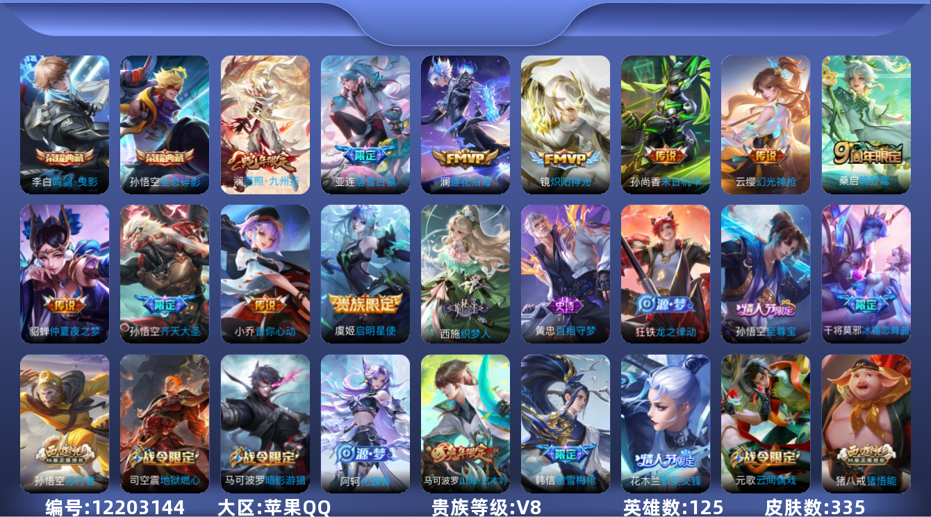 [12203144]V8 2典藏 11传说 125英雄 335皮肤 可修改实名 优质装备:鸣剑·曳影,全息碎影(猴子典藏),炽阳神光,末日机甲-孙尚香(绿蚂蚱),仲夏夜之梦(大飞蛾),音你心动-小乔,澜逐花归海 传说皮:落雪白狼,幻光神枪 珍宝阁皮:妄想食味,玩趣恶龙 限定皮:愿照·九州拓(澜年限),逐霄战戟,陌上桑,鸣野蒿,至尊宝,傲雪梅枪,高山流水,齐天大圣,天狼溯光者,李小龙,逐梦之影,默契交锋-花木兰,孙行者,猪悟能,引擎之心,冰霜恋舞曲,蜜橘之夏,匿光追影者,山海·玄木吟(马可年限) 史诗皮:器灵·浮梦炉,化蝶舞,星界战将,谪仙醉月,龙之律动,茶境仙,怒海争锋,破空之剑,琥珀纪元伽罗,上官婉儿群星魔术团,蔬乡物语(鲁班七号),超元猎域,百相守梦-百里守约,百相守梦-黄忠,织梦人,紫霞仙子,电玩小子(小书包),黄金分割率,特工魅影,千年之狐,永昼,雪夜绮愿(周瑜),百解令(蒙犽),高渐离燃音魔法,冰冠公主,偶像歌手,晚萤,龙骑士(小龙虾),末日机甲-吕布,猫狗日记-孙策,猫狗日记-大乔,乱世虎臣,节奏热浪,修罗,女仆咖啡,摇滚巨星,水果甜心,绅士熊喵,天才门将,星夜王子,心灵骇客,功夫厨神,德古拉伯爵,暗隐猎兽者,幽灵船长,鬼剑武藏,心灵战警,天秀·启明,舞动绿茵,地狱岩魂,纤云弄巧,繁星吟游(呼啦呼啦),拒霜思,缤纷独角兽,乘风破浪,逐浪之夏,水晶猎龙者,曙光守护者,箭羽风息,金属风暴,圣诞狂欢,圣诞恋歌,鹰眼统帅,魅力维加斯,黎明之约,未来纪元-赵云