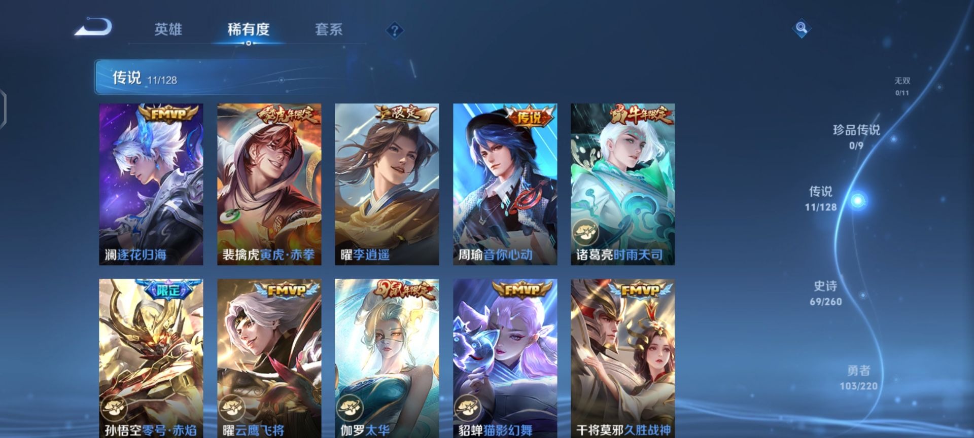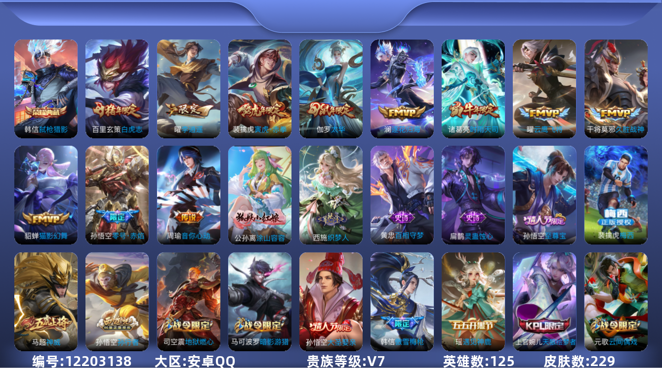 [12203138]V7 1典藏 11传说 125英雄 229皮肤 可修改实名 优质装备:弑枪猎影(韩信典藏),云鹰飞将(小将军),猫影幻舞,久胜战神,零号·赤焰,音你心动-周瑜,李逍遥,澜逐花归海,涂山容容 珍宝阁皮:女武神,玩趣恶龙 限定皮:至尊宝,白虎志(电光耗子),太华(伽罗年限),梅西,傲雪梅枪,魔法小厨娘,时雨天司(水龙头),神威(电光马子),遇见飞天,高山流水,五谷丰年,游园惊梦,梁祝,御风骁将(吕布年限),天狼绘梦者,李小龙,朱雀志(守约年限),孙行者,大圣娶亲,寅虎·心曲(虎婆),寅虎·赤拳(老虎年限) 史诗皮:灵蛊蚀心,百相守梦-黄忠,织梦人,遇见神鹿,电玩小子(小书包),白龙吟,永昼,江河有灵,魅语,百解令(蒙犽),蒙恬荣光圣徽,无限星赏官,冰冠公主,猫狗日记-孙策,猫狗日记-大乔,节奏热浪,修罗,水果甜心,星夜王子,时之奇旅-安琪拉,功夫厨神,德古拉伯爵,暗隐猎兽者,鬼剑武藏,心灵战警,纤云弄巧,繁星吟游(呼啦呼啦),缤纷独角兽,乘风破浪,逐浪之夏,龙鼓争鸣,水晶猎龙者,金属风暴,圣诞狂欢,圣诞恋歌,鹰眼统帅,无心,未来纪元-赵云