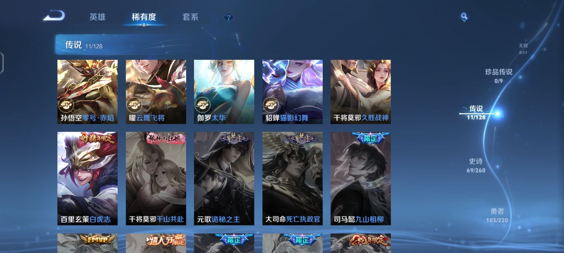 伽罗太华,吕布御风骁将,诸葛亮时雨天司,杨玉环寅虎·心曲,裴擒虎梅西,裴擒虎李小龙,裴擒虎寅虎·赤拳,上官婉儿梁祝,上官婉儿天狼绘梦者,安琪拉魔法小厨娘,孙悟空孙行者,孙悟空大圣娶亲,孙悟空至尊宝,百里玄策白虎志,马超神威,韩信傲雪梅枪,百里守约朱雀志