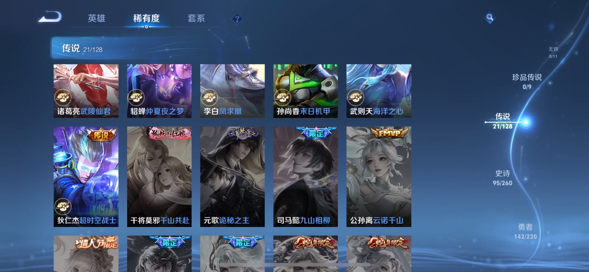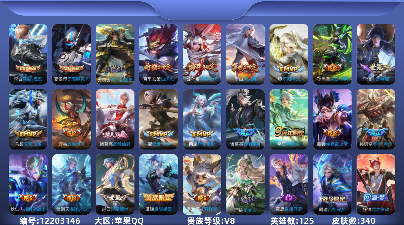 - [12277775]V7 1典藏 1无双 5传说 125英雄 251皮肤 可修改实名 优质装备:幻阙歌(貂蝉典藏),韩信群星魔术团(韩信无双),黄金射手座,无双飞将 珍宝阁皮:妄想食味,优雅恋人,蔷薇恋人 限定皮:鸣野蒿,至尊宝,神威(电光马子),飞衡(韩信年限),高山流水,诗剑行,齐天大圣,五谷丰年,青龙志(铠年限),梁祝,李小龙,逐梦之影 史诗皮:灵蛊蚀心,星界战将,埋骨钱,百相守梦-百里守约,百相守梦-黄忠,电玩小子(小书包),白龙吟,特工魅影,江河有灵,百解令(蒙犽),高渐离燃音魔法,蒙恬荣光圣徽,电玩·爆裂旋风,猫狗日记-孙策,乱世虎臣,摇滚巨星,水果甜心,绅士熊喵,天才门将,暗隐猎兽者,鬼剑武藏,舞动绿茵,地狱岩魂,繁星吟游(呼啦呼啦),拒霜思,缤纷独角兽,乘风破浪,逐浪之夏,箭羽风息,金属风暴,圣诞狂欢,圣诞恋歌,鹰眼统帅,魅力维加斯,黎明之约,无心,未来纪元-赵云