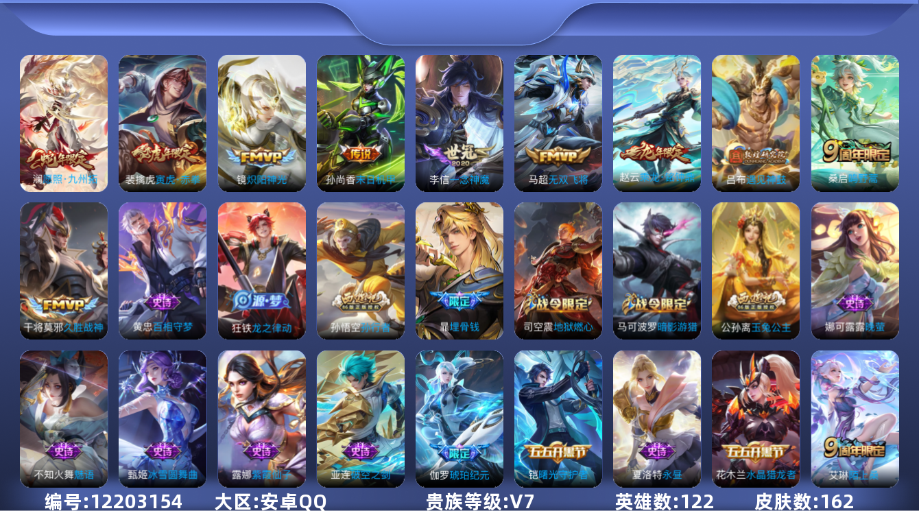 [12203154]V7 10传说 122英雄 162皮肤 可修改实名 优质装备:久胜战神,炽阳神光,一念神魔,末日机甲-孙尚香(绿蚂蚱),无双飞将,遇见神鼓 传说皮:乘龙·铭钟鼎(赵云年限) 珍宝阁皮:玩趣恶龙 限定皮:愿照·九州拓(澜年限),陌上桑,鸣野蒿,孙行者,寅虎·赤拳(老虎年限),玉兔公主 史诗皮:星界战将,龙之律动,茶境仙,破空之剑,埋骨钱,琥珀纪元伽罗,决胜骁骑,百相守梦-黄忠,紫霞仙子,黄金分割率,千年之狐,永昼,江河有灵,魅语,百解令(蒙犽),蒙恬荣光圣徽,冰冠公主,偶像歌手,晚萤,末日机甲-吕布,猫狗日记-大乔,水果甜心,天才门将,星夜王子,暗隐猎兽者,鬼剑武藏,心灵战警,乘风破浪,逐浪之夏,月团寄思,水晶猎龙者,曙光守护者,金属风暴,原初追逐者,鹰眼统帅