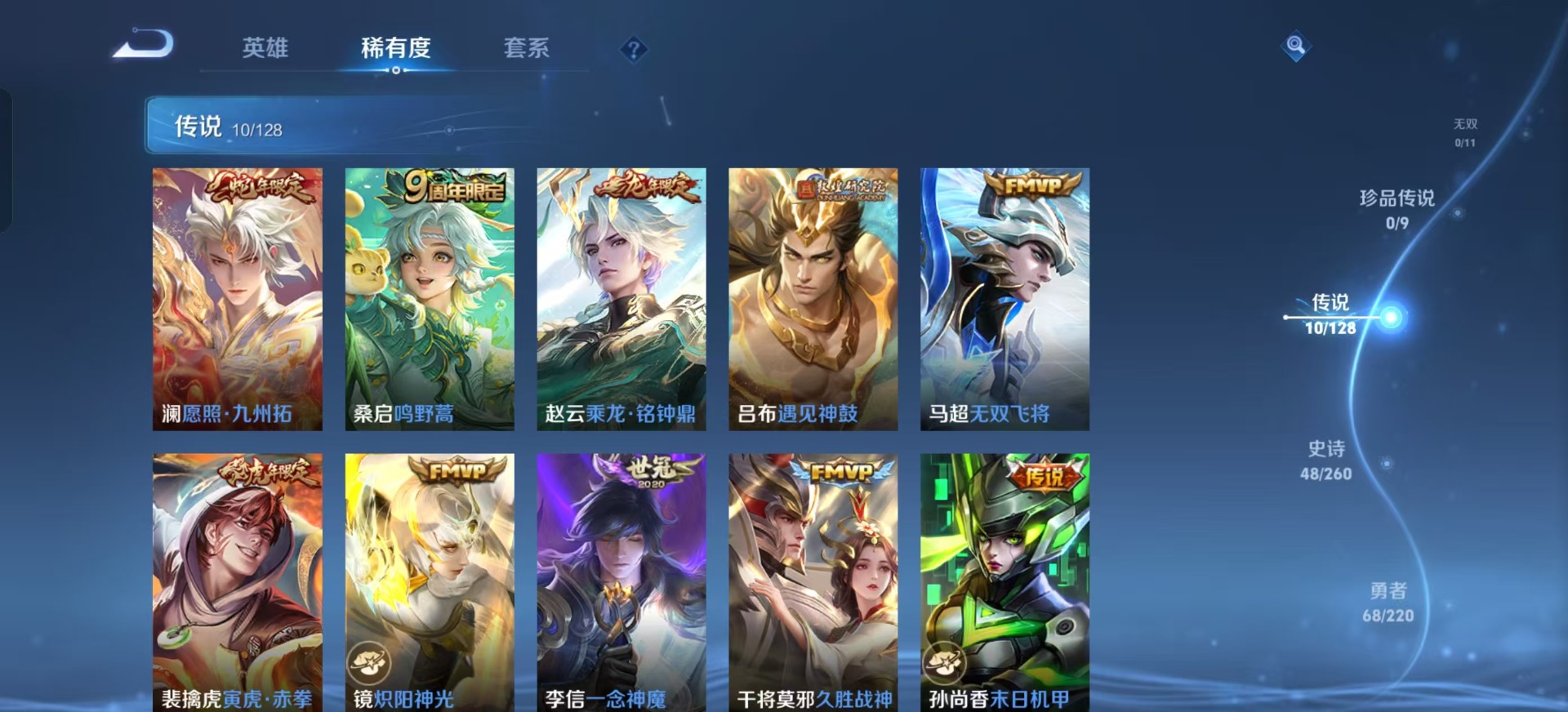 - [11930352]V7 1典藏 2珍品传说 9传说 125英雄 224皮肤 可修改实名 优质装备:最初的交响(伽罗典藏),朽木白哉,黑崎一护,黄金狮子座,久胜战神,末日机甲-孙尚香(绿蚂蚱),游龙清影(小青龙),超时空战士-狄仁杰,山海·炽霜斩(李信年限),涂山容容 传说皮:乘龙·问璇玑(孙尚香年限),死亡执政官 珍宝阁皮:玩趣恶龙 限定皮:冰锋战神,武圣,烈魂,虎魄,李小龙,逐梦之光,奇迹圣诞,冰霜恋舞曲,云端筑梦师,山海·玄木吟(马可年限) 史诗皮:鸭鸭历险记-刘禅,龙之律动,石田雨龙,百相守梦-周瑜,幻珠鲛人,百相守梦-黄忠,守夜人,电玩小子(小书包),黄金分割率,千年之狐,蒙恬荣光圣徽,青蛇,龙骑士(小龙虾),猫狗日记-孙策,修罗,摇滚巨星,水果甜心,绅士熊喵,星夜王子,心灵骇客,功夫厨神,暗隐猎兽者,鬼剑武藏,舞动绿茵,纤云弄巧,繁星吟游(呼啦呼啦),拒霜思,乘风破浪,水晶猎龙者,热力回旋,金属风暴,原初追逐者,圣诞狂欢,圣诞恋歌,鹰眼统帅,黎明之约,赏金猎手,无心