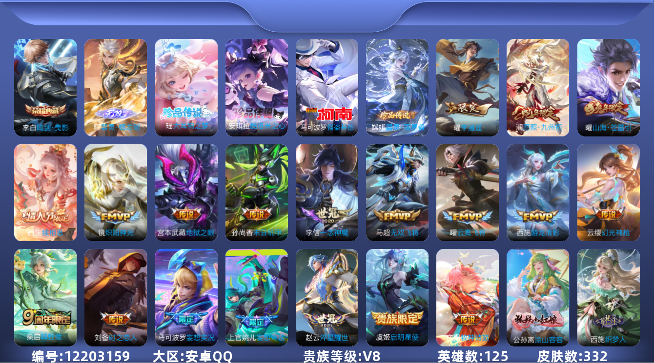 [12203159]V8 1典藏 1无双 4珍品传说 19传说 125英雄 332皮肤 可修改实名 优质装备:鸣剑·曳影,器灵·螭龙剑,怪盗基德,器灵·落星盏,酷洛米之心,大耳狗之梦,云鹰飞将(小将军),炽阳神光,一念神魔,末日机甲-孙尚香(绿蚂蚱),地狱之眼,李逍遥,时之恋人-刘备(电焊工),游龙清影(小青龙),淬星耀世,无双飞将,山海·苍雷引(电光曜子),妄想实况,妄想奇谈,牧神诗旅,涂山容容 传说皮:续相思,幻光神枪 珍宝阁皮:妄想食味,蔷薇恋人 限定皮:愿照·九州拓(澜年限),逐霄战戟,陌上桑,鸣野蒿,至尊宝,飞衡(韩信年限),五谷丰年,青龙志(铠年限),梁祝,辉光之辰,如梦令-嫦娥,默契交锋-花木兰,引擎之心,时之奇旅-妲己 史诗皮:赞萌露比,鸭鸭历险记-刘禅,器灵·浮梦炉,化蝶舞,龙之律动,灵蛊蚀心,布丁狗之誓,百相守梦-周瑜,茶境仙,百相守梦-黄忠,谪仙醉月,星界特工,炽弈燎原,破空之剑,蔬乡物语(鲁班七号),超元猎域,百相守梦-百里守约,守夜人,织梦人,遇见神鹿,紫霞仙子,苍穹之光,黄金分割率,特工魅影,永昼,冰冠公主,江河有灵,雪夜绮愿(周瑜),百解令(蒙犽),高渐离燃音魔法,蒙恬荣光圣徽,电玩·爆裂旋风,无限星赏官,晚萤,末日机甲-吕布,猫狗日记-孙策,猫狗日记-大乔,时之恋人-孙尚香,乱世虎臣,节奏热浪,修罗,女仆咖啡,摇滚巨星,水果甜心,绅士熊喵,天才门将,星夜王子,心灵骇客,功夫厨神,德古拉伯爵,幽灵船长,鬼剑武藏,心灵战警,天秀·启明,舞动绿茵,地狱岩魂,纤云弄巧,拒霜思,缤纷独角兽,乘风破浪,逐浪之夏,水晶猎龙者,曙光守护者,热力回旋,箭羽风息,金属风暴,圣诞狂欢,圣诞恋歌,鹰眼统帅,暗夜贵公子,魅力维加斯,赏金猎手,无心,未来纪元-赵云