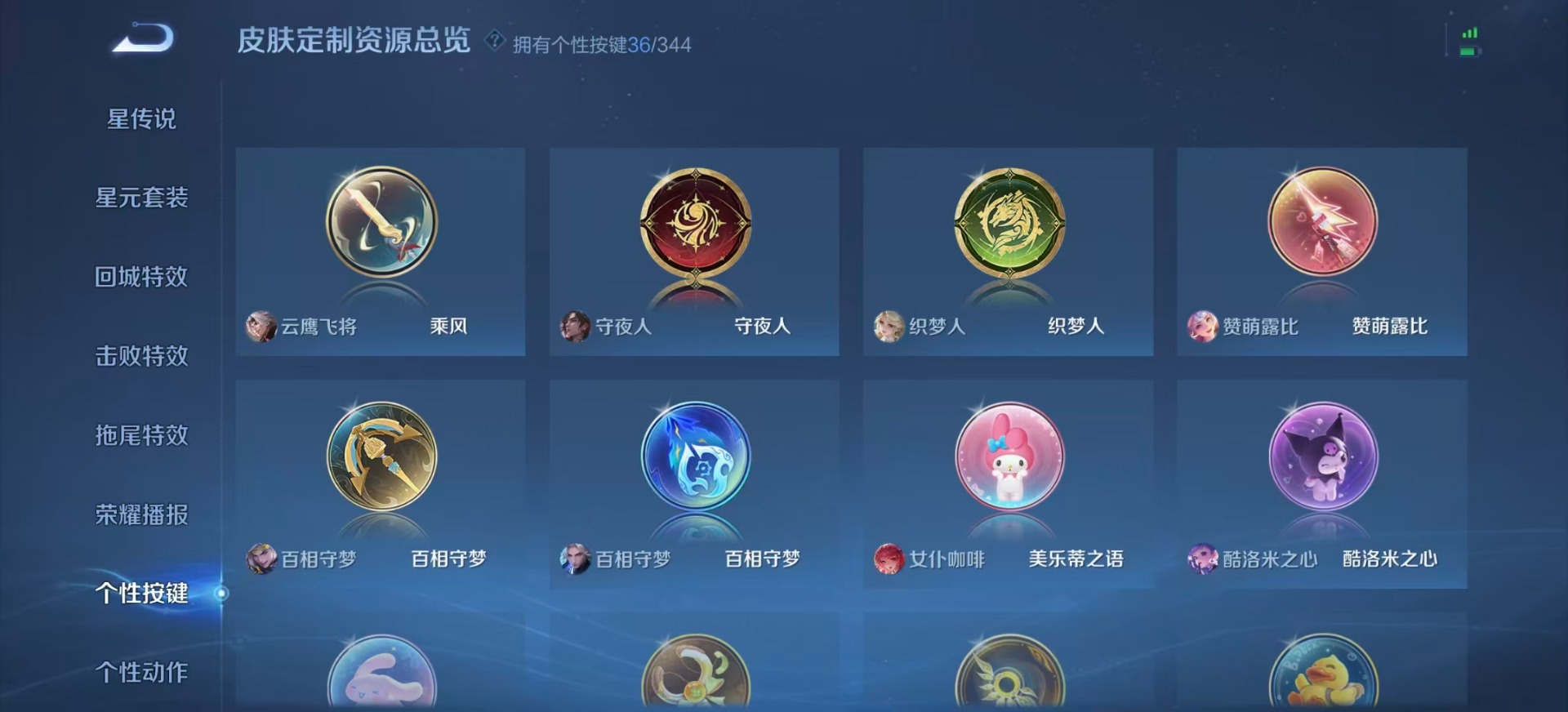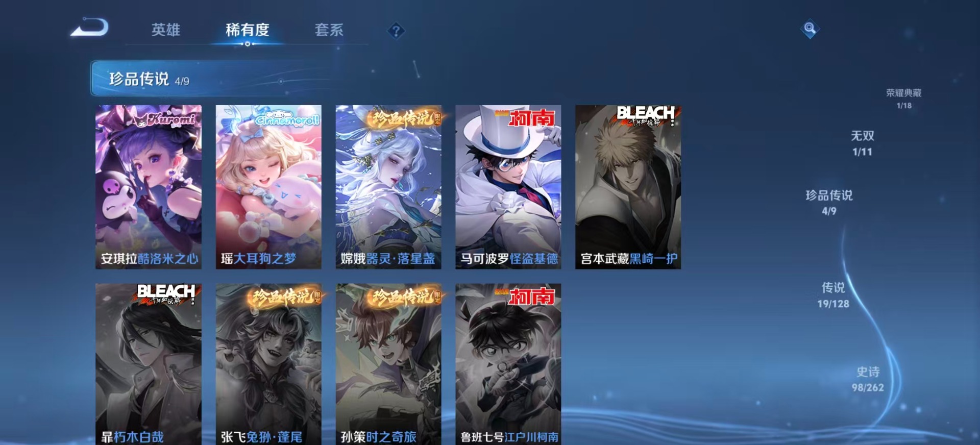 铠青龙志,后羿辉光之辰,上官婉儿梁祝,花木兰默契交锋,艾琳陌上桑,桑启鸣野蒿,孙悟空至尊宝,赵云引擎之心,妲己时之奇旅,韩信飞衡,澜愿照·九州拓,嫦娥如梦令