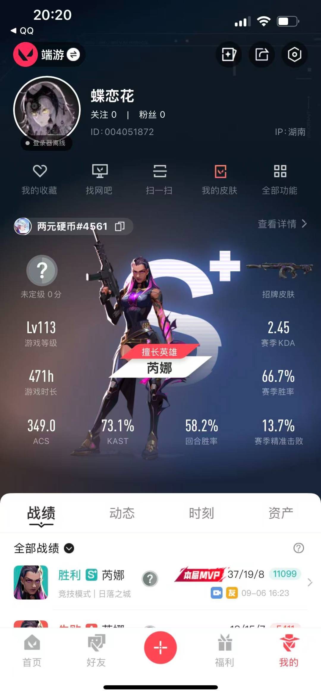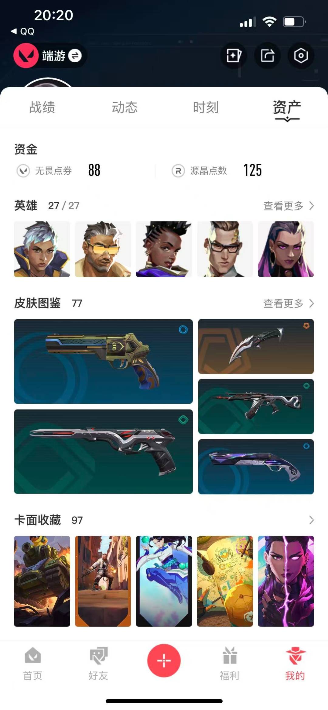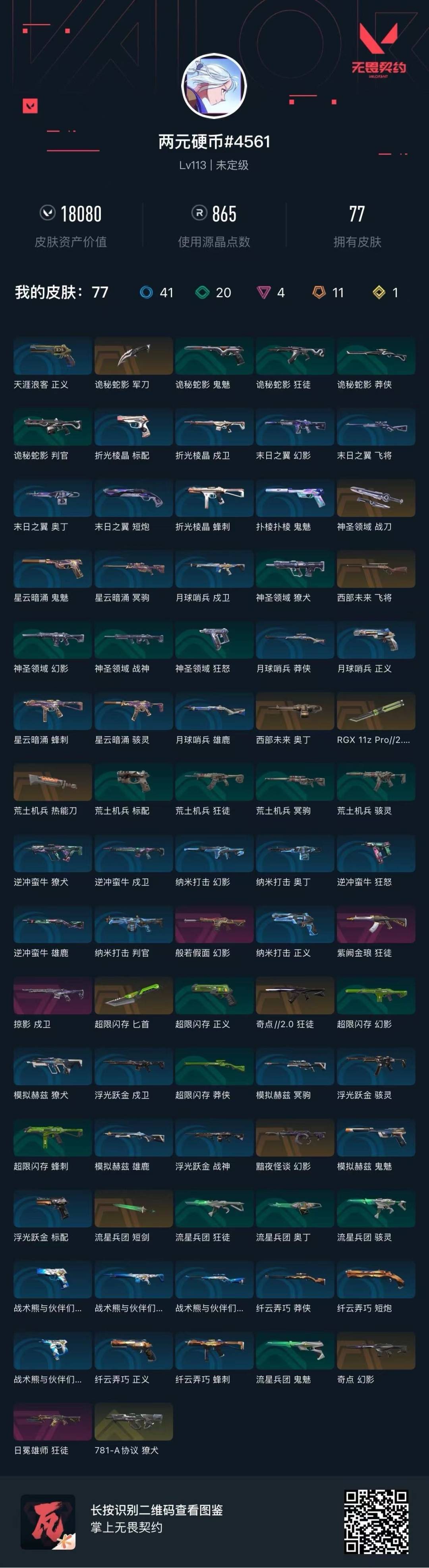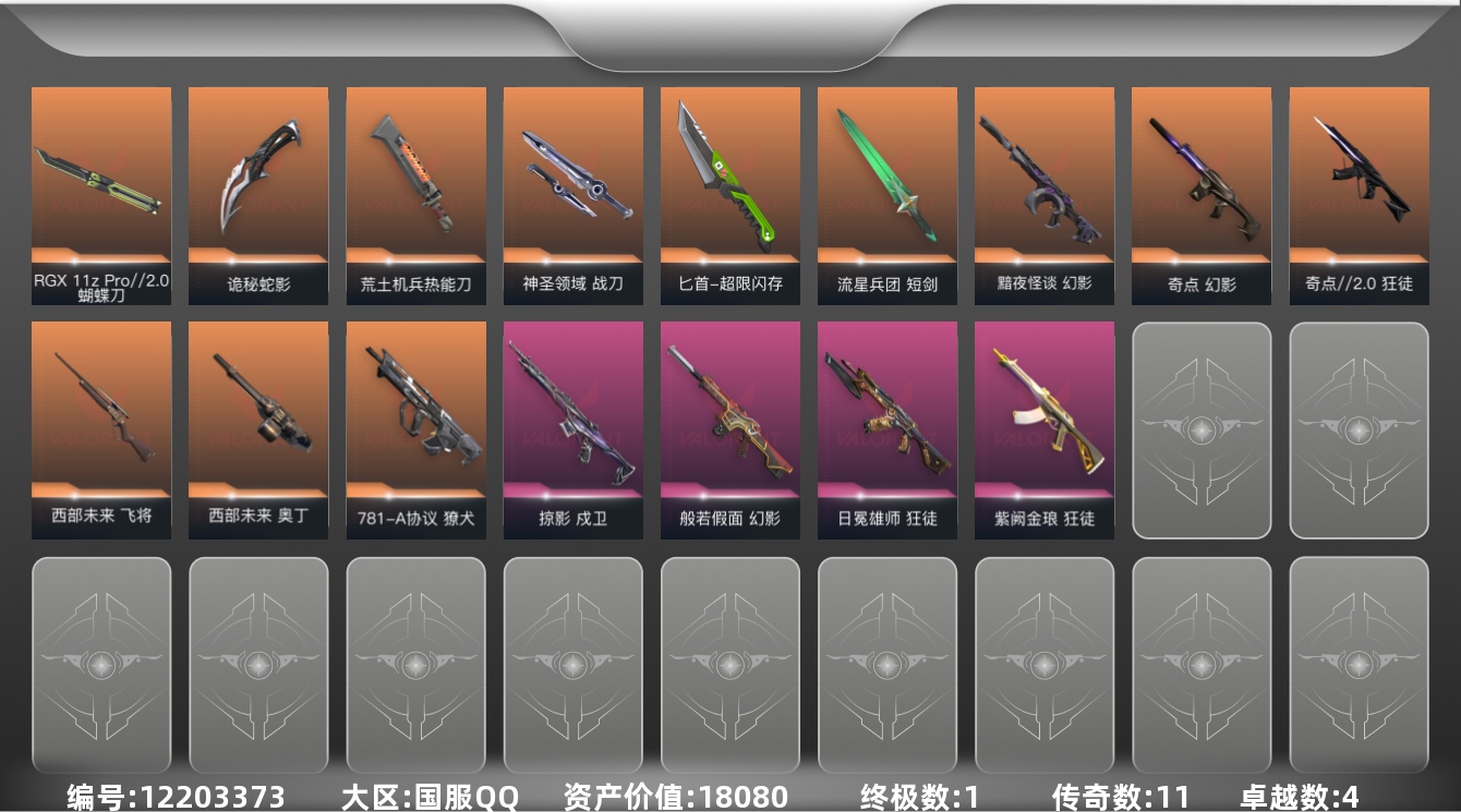 [12203373]11橙皮 1金皮 4紫皮 77皮肤 27英雄 97卡面 865已用源晶 未定级 优质装备:幻影-奇点,狂徒-紫阙金琅,獠犬-781-A协议,幻影-般若假面,狂徒-日冕雄师,幻影-黯夜怪谈,狂徒-奇点//2.0,戍卫-掠影,匕首-超限闪存,荒土机兵热能刀,神圣领域 战刀,RGX 11z Pro//2.0 蝴蝶刀,诡秘蛇影 狙击枪皮肤:飞将-西部未来 机枪皮肤:奥丁-西部未来 近战武器皮肤:短剑-流星兵团