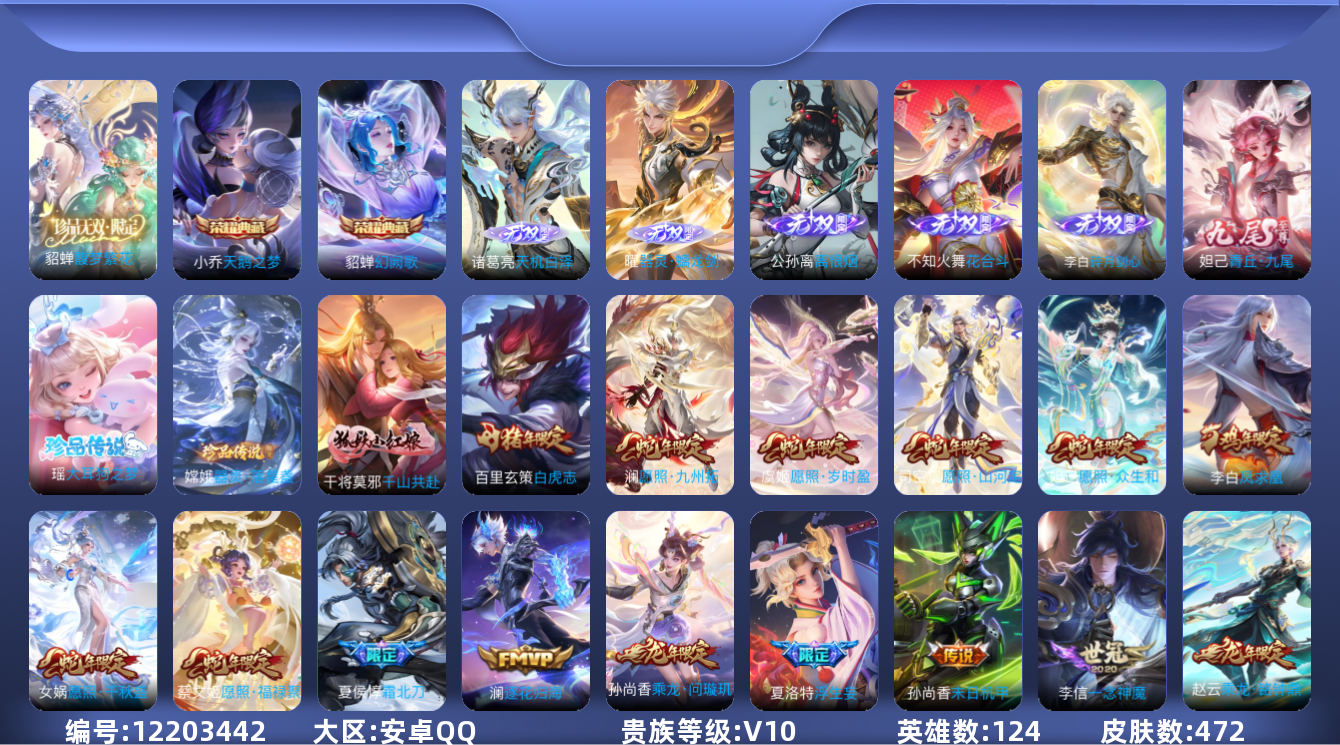 [12203442]V10 2典藏 1珍品无双 6无双 2珍品传说 45传说 124英雄 472皮肤 可修改实名 优质装备:馥梦繁花,天鹅之梦(小乔典藏),幻阙歌(貂蝉典藏),青丘·九尾(妲己无双),碎月剑心(李白无双),花合斗,离恨烟(公孙离无双),器灵·螭龙剑,天机白泽,器灵·落星盏,大耳狗之梦,黄金射手座,冠军飞将,云鹰飞将(小将军),绛天战甲(鸡嘴战神),黄金白羊座,猫影幻舞,久胜战神,一念神魔,末日机甲-孙尚香(绿蚂蚱),仲夏夜之梦(大飞蛾),音你心动-小乔,飞鸢探春,乞巧织情,时之恋人-刘备(电焊工),游龙清影(小青龙),末日机甲-孙策,浮生妄,记忆之芯(机甲兔),青丘·九尾,妄想实况,惊梅引,小动物乐团,澜逐花归海,艾琳觅芳踪,千劫归真,千山共赴,涂山容容 传说皮:乘龙·问璇玑(孙尚香年限),乘龙·铭钟鼎(赵云年限),貂蝉曦玄引,吕布曦玄引,铠冥王哈迪斯,幻光神枪 珍宝阁皮:妄想食味,优雅恋人,女武神 限定皮:愿照·九州拓(澜年限),愿照·福禄聚(蔡文姬年限),愿照·岁时盈(虞姬年限),愿照·山河定(司空震年限),愿照·众生和(妲己年限),愿照·千秋盛(女娲年限),逐霄战戟,陌上桑,鸣野蒿,夏侯惇霜北刀,至尊宝,白虎志(电光耗子),凤求凰(白切鸡),凤凰于飞,异界灵契(白毛香),傲雪梅枪,绯月行,白晶晶,神威(电光马子),瑞麟志(木兰年限),至美·乘鲤谣,遇见飞天,高山流水,五谷丰年,冰锋战神,幽恒(沐浴露),游园惊梦,梁祝,天狼狩猎者,烈魂,岱宗(典韦年限),天狼溯光者,逐梦之音,李小龙,朱雀志(守约年限),辉光之辰,如梦令-后羿,孙行者,一生所爱,大圣娶亲,引擎之心,青春决赛季,冰霜恋舞曲,神奇女侠,寅虎·瑞焰(虎皮蛋子),时之奇旅-妲己,神器·万象笔,山海·玄木吟(马可年限),冰霜神祇 史诗皮:鸭鸭历险记-刘禅,飞车小橘子,器灵·浮梦炉,化蝶舞,龙之律动,灵蛊蚀心,星界战将,百相守梦-周瑜,茶境仙,乘龙·忆丹青(大乔年限),百相守梦-黄忠,破空之剑,涂山红红,东方月初,蒙犽顽岩魄,芈月浮光幕影,乘龙·聚宝船(安琪拉年限),海诺心动手记,奇遇星旅,蔬乡物语(鲁班七号),曹操夜都魔契,幻珠鲛人,守夜人,织梦人,遇见神鹿,紫霞仙子,苍穹之光,黄金分割率,特工魅影,千年之狐,永昼,冰冠公主,白蛇,浮梦罗烟,末日机甲-莱西奥,江河有灵,雪夜绮愿(周瑜),青蛇,高渐离燃音