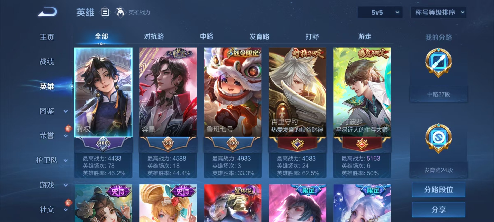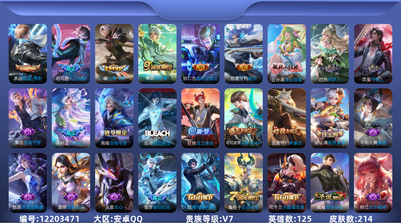 [12203471]V7 1典藏 5传说 125英雄 214皮肤 可修改实名 优质装备:鸣剑·曳影,云鹰飞将(小将军),超时空战士-狄仁杰,碎云,涂山容容 传说皮:九山相柳 珍宝阁皮:妄想食味,优雅恋人 限定皮:逐霄战戟,陌上桑,鸣野蒿,遇见飞天,五谷丰年,梁祝,朱雀志(守约年限),山海·玄木吟(马可年限) 史诗皮:龙之律动,石田雨龙,百相守梦-周瑜,幻珠鲛人,琥珀纪元伽罗,蔬乡物语(鲁班七号),百相守梦-百里守约,百相守梦-黄忠,织梦人,守夜人,紫霞仙子,黄金分割率,特工魅影,千年之狐,江河有灵,末日机甲-莱西奥,雪夜绮愿(周瑜),真我赫兹(百里守约),魅语,百解令(蒙犽),高渐离燃音魔法,蒙恬荣光圣徽,冰冠公主,青蛇,猫狗日记-孙策,猫狗日记-大乔,女仆咖啡,水果甜心,天才门将,星夜王子,心灵骇客,德古拉伯爵,暗隐猎兽者,鬼剑武藏,心灵战警,舞动绿茵,地狱岩魂,纤云弄巧,拒霜思,缤纷独角兽,乘风破浪,逐浪之夏,水晶猎龙者,曙光守护者,金属风暴,原初追逐者,圣诞恋歌,鹰眼统帅,魅力维加斯,黎明之约,滕王阁序,无心