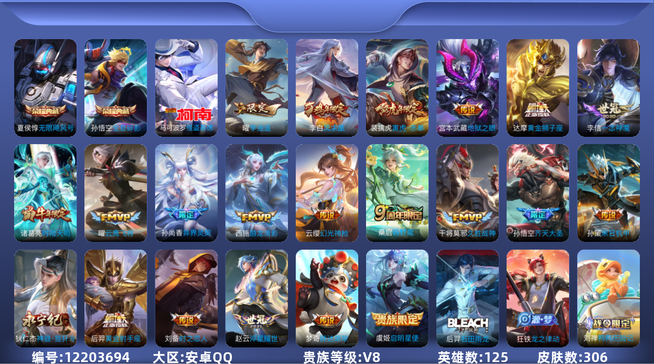 [12203694]V8 2典藏 1珍品传说 21传说 125英雄 306皮肤 可修改实名 优质装备:无限飓风号(高达),全息碎影(猴子典藏),怪盗基德,黄金狮子座,黄金射手座,云鹰飞将(小将军),久胜战神,一念神魔,地狱之眼,胖达荣荣,李逍遥,时之恋人-刘备(电焊工),游龙清影(小青龙),淬星耀世,末日机甲-孙策,神器·狴犴令 传说皮:幻光神枪 珍宝阁皮:妄想食味,胡桃夹子,玩趣恶龙 限定皮:鸣野蒿,至尊宝,凤求凰(白切鸡),异界灵契(白毛香),傲雪梅枪,时雨天司(水龙头),神威(电光马子),高山流水,齐天大圣,五谷丰年,青龙志(铠年限),冰锋战神,御风骁将(吕布年限),天狼绘梦者,逐梦之影,朱雀志(守约年限),如梦令-后羿,默契交锋-花木兰,孙行者,猪悟能,一生所爱,冰霜恋舞曲,寅虎·赤拳(老虎年限),时之祈愿-云中君,百木心枪,山海·玄木吟(马可年限) 史诗皮:鸭鸭历险记-刘禅,化蝶舞,星界战将,龙之律动,石田雨龙,蔬乡物语(鲁班七号),特工魅影,千年之狐,江河有灵,魅语,蒙恬荣光圣徽,冰冠公主,偶像歌手,电玩·爆裂旋风,猫狗日记-孙策,猫狗日记-大乔,时之恋人-孙尚香,乱世虎臣,节奏热浪,修罗,女仆咖啡,摇滚巨星,水果甜心,绅士熊喵,天才门将,星夜王子,心灵骇客,时之奇旅-安琪拉,功夫厨神,德古拉伯爵,暗隐猎兽者,幽灵船长,鬼剑武藏,心灵战警,乐园奇幻夜,舞动绿茵,地狱岩魂,纤云弄巧,缤纷独角兽,乘风破浪,逐浪之夏,水晶猎龙者,曙光守护者,热力回旋,唤灵魅影,金属风暴,原初追逐者,圣诞狂欢,圣诞恋歌,鹰眼统帅,魅力维加斯,黎明之约,赏金猎手,未来纪元-赵云