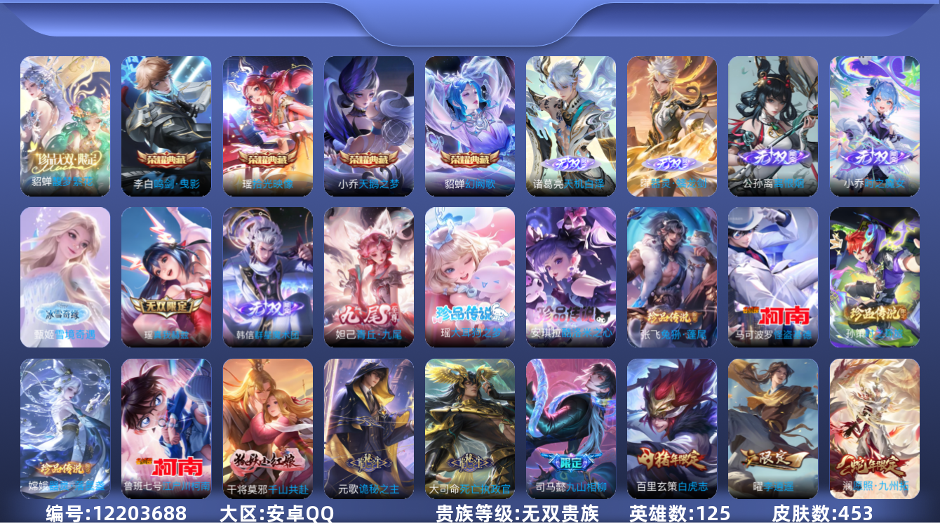 [12203688]无双贵族 4典藏 1珍品无双 8无双 7珍品传说 71传说 125英雄 453皮肤 可修改实名 女号 优质装备:馥梦繁花,天鹅之梦(小乔典藏),鸣剑·曳影,幻阙歌(貂蝉典藏),真我赫兹(瑶)(瑶无双),青丘·九尾(妲己无双),小乔时之魔女(小乔无双),韩信群星魔术团(韩信无双),离恨烟(公孙离无双),拾光映像(瑶典藏),雪境奇遇-甄姬,器灵·螭龙剑,天机白泽,江户川柯南,怪盗基德,器灵·落星盏,酷洛米之心,大耳狗之梦,冠军飞将,久胜战神,一念神魔,仲夏夜之梦(大飞蛾),音你心动-小乔,飞鸢探春,李逍遥,时之恋人-刘备(电焊工),游龙清影(小青龙),遇见胡旋,末日机甲-孙策,挚爱之约,挚爱花嫁,碎云,山海·炽霜斩(李信年限),山海·琳琅生(小乔年限),燃星之曲,画中仙,浮生妄,青丘·九尾,鹤羽星尊,灼幽烈阳,妄想实况,妄想奇谈,鹤归松栖(云缨),鲁班七号-时之奇旅,大乔-时之奇旅,永恒水手月亮,夜礼服假面,澜逐花归海,艾琳觅芳踪,琥珀纪元铠,金乌负日,黄金天蝎座,云中君群星魔术团,朵莉亚心动手记,牧神诗旅,玄雷天君,诡秘之主,千山共赴,涂山容容 珍品传说:时之奇旅-孙策,兔狲·蓬尾 传说皮:乘龙·问璇玑(孙尚香年限),乘龙·铭钟鼎(赵云年限),乘龙·淬吴钩(孙策年限),貂蝉曦玄引,落雪白狼,死亡执政官,九山相柳,续相思,星之鸣奏,祥瑞亨通,幻光神枪 珍宝阁皮:妄想食味,优雅恋人,蔷薇恋人,女武神 限定皮:愿照·九州拓(澜年限),愿照·福禄聚(蔡文姬年限),愿照·岁时盈(虞姬年限),愿照·山河定(司空震年限),愿照·众生和(妲己年限),愿照·千秋盛(女娲年限),逐霄战戟,映山客,陌上桑,鸣野蒿,白虎志(电光耗子),太华(伽罗年限),异界灵契(白毛香),傲雪梅枪,补天,寅虎·展翼(孙膑年限),星穹之声,绯月行,时之彼端,白鹤梁神女,魔法小厨娘,白晶晶,时雨天司(水龙头),神威(电光马子),山海·碧波行(瑶年限),至美·乘鲤谣,至美·化雀舞,遇见飞天,高山流水,诗剑行,五谷丰年,梁祝,天狼溯光者,天狼绘梦者,李小龙,朱雀志(守约年限),霸王别姬-虞姬,默契交锋-兰陵王,大圣娶亲,蜜橘之夏,寅虎·心曲(虎婆),时之祈愿-云中君,时之祈愿-瑶(瑶传限),百木心枪,启示之音,时之奇旅-妲己,神器·万象笔,山海·玄木吟(马可年限) 史诗皮:赞萌露比