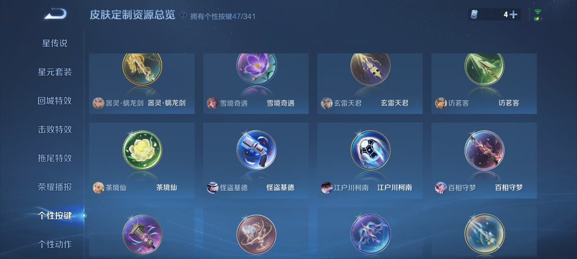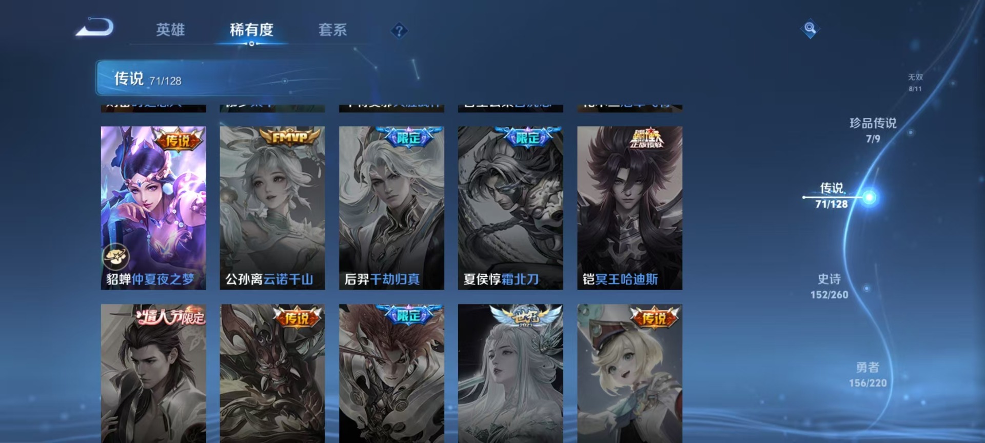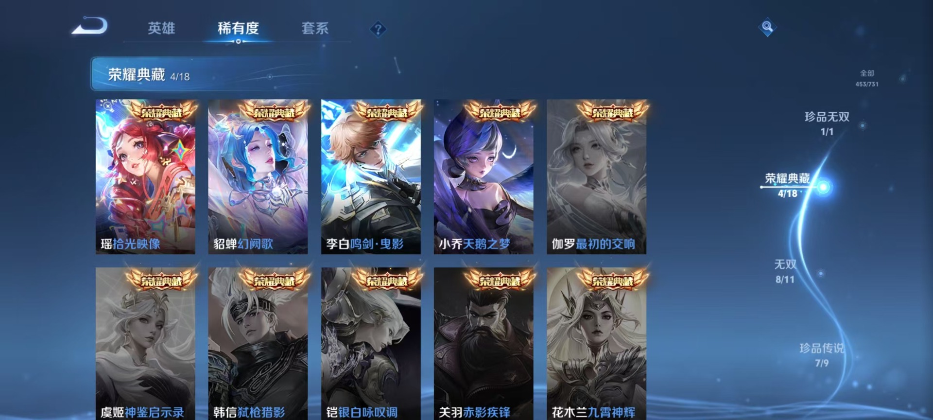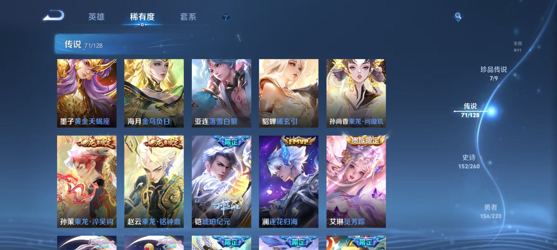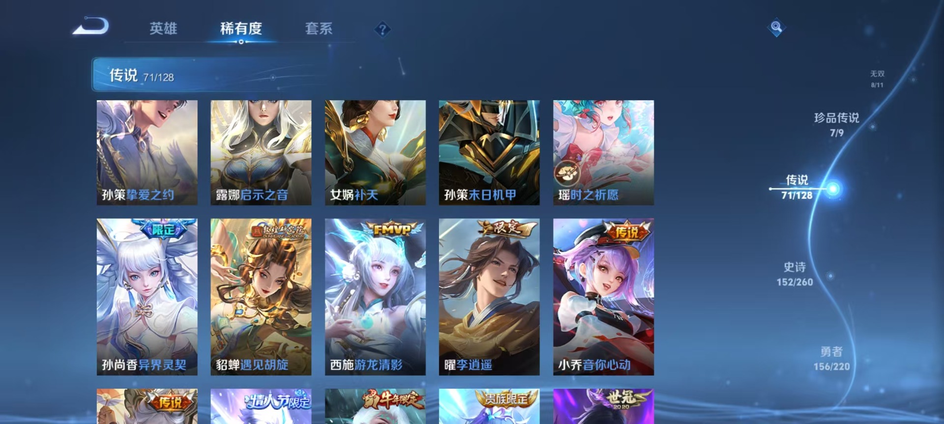 大乔白蛇,大乔猫狗日记,高渐离燃音魔法,大乔乘龙·忆丹青,海诺心动手记,刘邦德古拉伯爵,夏侯惇乘风破浪,阿轲暗夜猫娘,阿轲节奏热浪,曹操夜都魔契,廉颇地狱岩魂,伽罗琥珀纪元,小乔缤纷独角兽,小乔青蛇,孙尚香时之恋人,孙策猫狗日记,海月浮梦罗烟,赵怀真鹤归松栖,赵怀真器灵·浮梦炉,项羽苍穹之光,吕布圣诞狂欢,吕布末日机甲,镜真我赫兹,周瑜雪夜绮愿,刘禅电玩·爆裂旋风,司马懿暗渊魔法,刘禅绅士熊喵,宫本武藏鬼剑武藏,兰陵王暗隐猎兽者,貂蝉圣诞恋歌,貂蝉唤灵魅影,李白谪仙醉月,花木兰水晶猎龙者,李白千年之狐,夏洛特永昼,上官婉儿群星魔术团,安琪拉心灵骇客,安琪拉乘龙·聚宝船,蒙犽百解令,安琪拉时之奇旅,艾琳奇遇舞章,杨戬天秀·启明,白起星夜王子,西施诗语江南,亚瑟心灵战警,嬴政摇滚巨星,嬴政暗夜贵公子,桑启奇遇星旅,程咬金功夫厨神,百里玄策热力回旋,百里玄策原初追逐者,雅典娜冰冠公主,韩信白龙吟,李元芳匿光侦查者,百里守约真我赫兹,百里守约特工魅影,李元芳逐浪之夏,墨子龙骑士,墨子金属风暴,蔡文姬舞动绿茵,瑶遇见神鹿,弈星滕王阁序,娜可露露晚萤,王昭君偶像歌手,嫦娥拒霜思,钟馗乐园奇幻夜,橘右京修罗