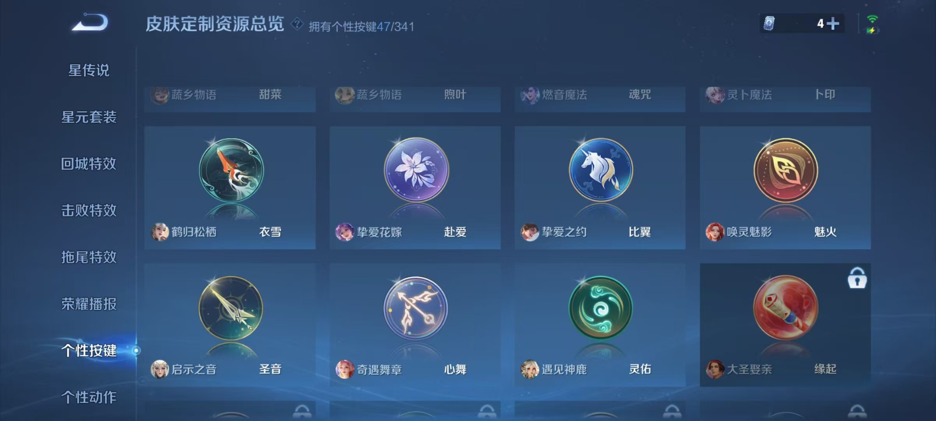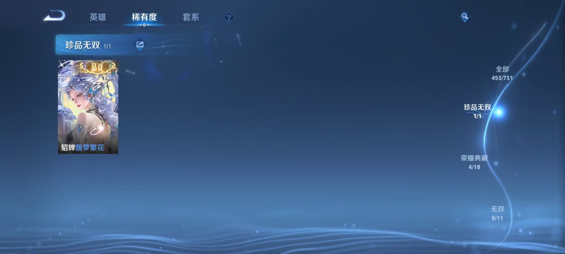 大乔挚爱花嫁,大乔时之奇旅,刘备时之恋人,铠琥珀纪元,赵云乘龙·铭钟鼎,干将莫邪久胜战神,小乔音你心动,干将莫邪画中仙,李信一念神魔,孙策末日机甲,孙策挚爱之约,孙策乘龙·淬吴钩,孙尚香乘龙·问璇玑,海月金乌负日,鲁班七号时之奇旅,庄周牧神诗旅,朵莉亚心动手记,杨玉环星之鸣奏,亚连落雪白狼,貂蝉遇见胡旋,裴擒虎祥瑞亨通,夏洛特浮生妄,艾琳觅芳踪,西施游龙清影,西施续相思,狄仁杰夜礼服假面,嬴政玄雷天君,曜李逍遥,云中君群星魔术团,百里守约碎云,李元芳飞鸢探春,墨子黄金天蝎座,澜逐花归海,貂蝉曦玄引,王昭君永恒水手月亮,云缨幻光神枪