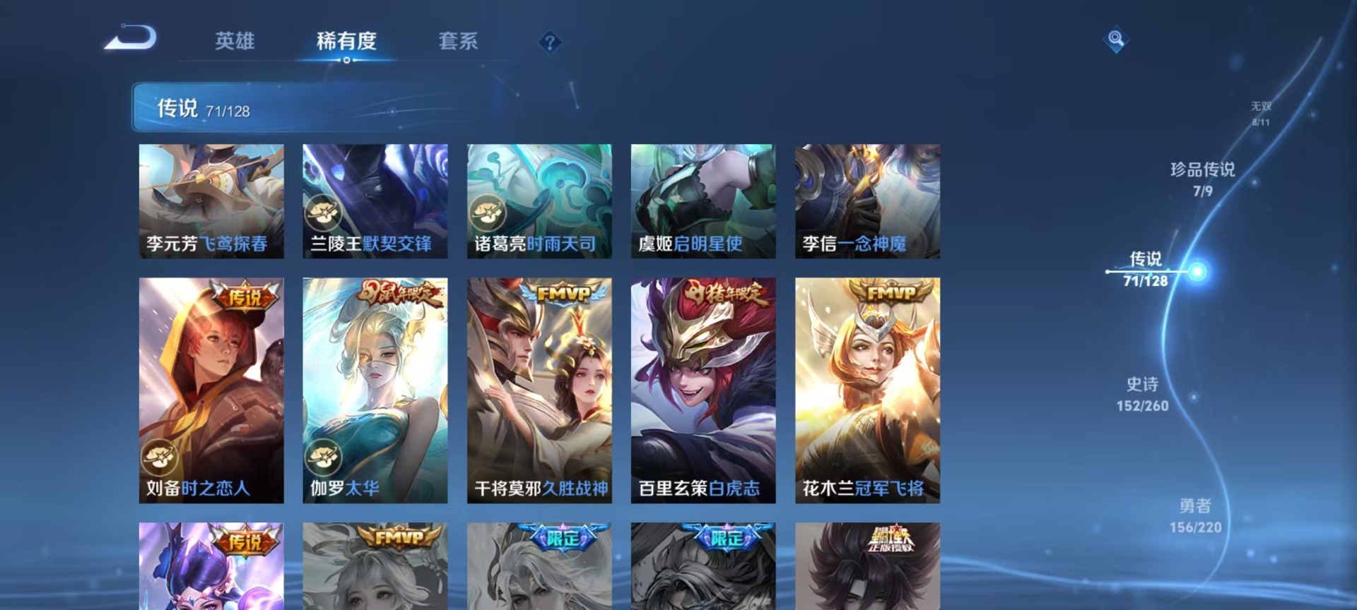 - PX_2095764-贵族等级: V7 英雄数: 125 皮肤数: 132 传说皮: 久胜战神,末日机甲-孙尚香,地狱火 限定皮: 梁祝,辉光之辰,神威,飞衡,凤求凰,至尊宝,五谷丰年,鸣野蒿