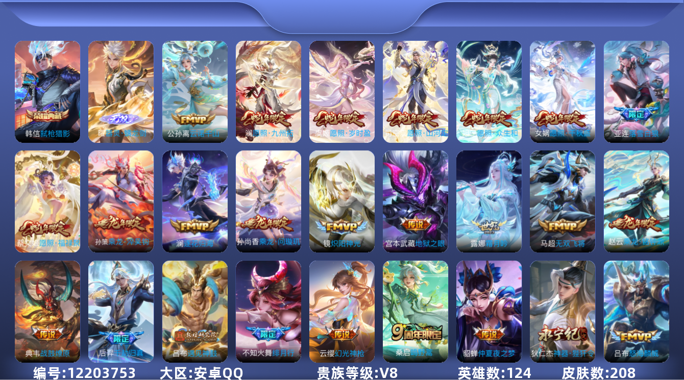 [12203753]V8 1典藏 1无双 28传说 124英雄 208皮肤 可修改实名 优质装备:弑枪猎影(韩信典藏),器灵·螭龙剑,黄金射手座,炽阳神光,仲夏夜之梦(大飞蛾),地狱之眼,胖达荣荣,无双飞将,神器·狴犴令,遇见神鼓,霜月吟,澜逐花归海,千劫归真 传说皮:乘龙·问璇玑(孙尚香年限),乘龙·铭钟鼎(赵云年限),乘龙·淬吴钩(孙策年限),典韦战鼓燎原,落雪白狼,云诺千山,幻光神枪 珍宝阁皮:妄想食味,玩趣恶龙 限定皮:愿照·九州拓(澜年限),愿照·福禄聚(蔡文姬年限),愿照·岁时盈(虞姬年限),愿照·山河定(司空震年限),愿照·众生和(妲己年限),愿照·千秋盛(女娲年限),鸣野蒿,至尊宝,绯月行,怒海麟威,五谷丰年,李小龙,孙行者,时之祈愿-云中君,冰霜神祇 史诗皮:器灵·浮梦炉,化蝶舞,星界战将,龙之律动,茶境仙,炽弈燎原,撼地雄心,破空之剑,战舞者,上官婉儿群星魔术团,蔬乡物语(鲁班七号),百相守梦-百里守约,星界特工,紫霞仙子,苍穹之光,特工魅影,江河有灵,百解令(蒙犽),高渐离燃音魔法,蒙恬荣光圣徽,偶像歌手,电玩·爆裂旋风,末日机甲-吕布,猫狗日记-孙策,乱世虎臣,女仆咖啡,水果甜心,绅士熊喵,天才门将,星夜王子,心灵骇客,功夫厨神,德古拉伯爵,暗隐猎兽者,幽灵船长,鬼剑武藏,暗渊魔法,心灵战警,乐园奇幻夜,地狱岩魂,纤云弄巧,拒霜思,乘风破浪,逐浪之夏,水晶猎龙者,曙光守护者,箭羽风息,金属风暴,原初追逐者,圣诞狂欢,鹰眼统帅,黎明之约,无心,未来纪元-赵云